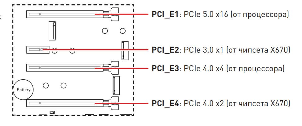 Всего на плате есть 4 слота: слот PCIe x16_1 (PCI_E1) (для видеокарт или других устройств), слот PCIe x16_2 (PCI_E3, фактически имеющий 4 линии), один PCIe_x1 (PCI_E2) и один PCIe x16_3 (PCI_E4, поддерживающий только 2 линии). Если про первый PCIe x16 я выше уже рассказал (он подключен к CPU), то PCIe x16_2 подключен также к процессору (но 4-мя линиями PCIe 4.0), а вот третий «длинный» PCIe x16_3 (PCI_E4) подключен к X670E и работает в режиме х2. Также и PCIe x1 (PCI_E2) подключен к чипсету X670E, но уже линией PCIe 3.0.