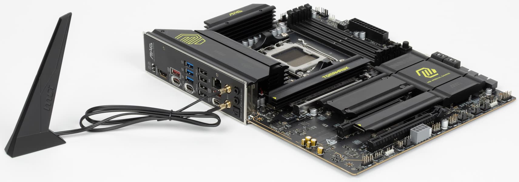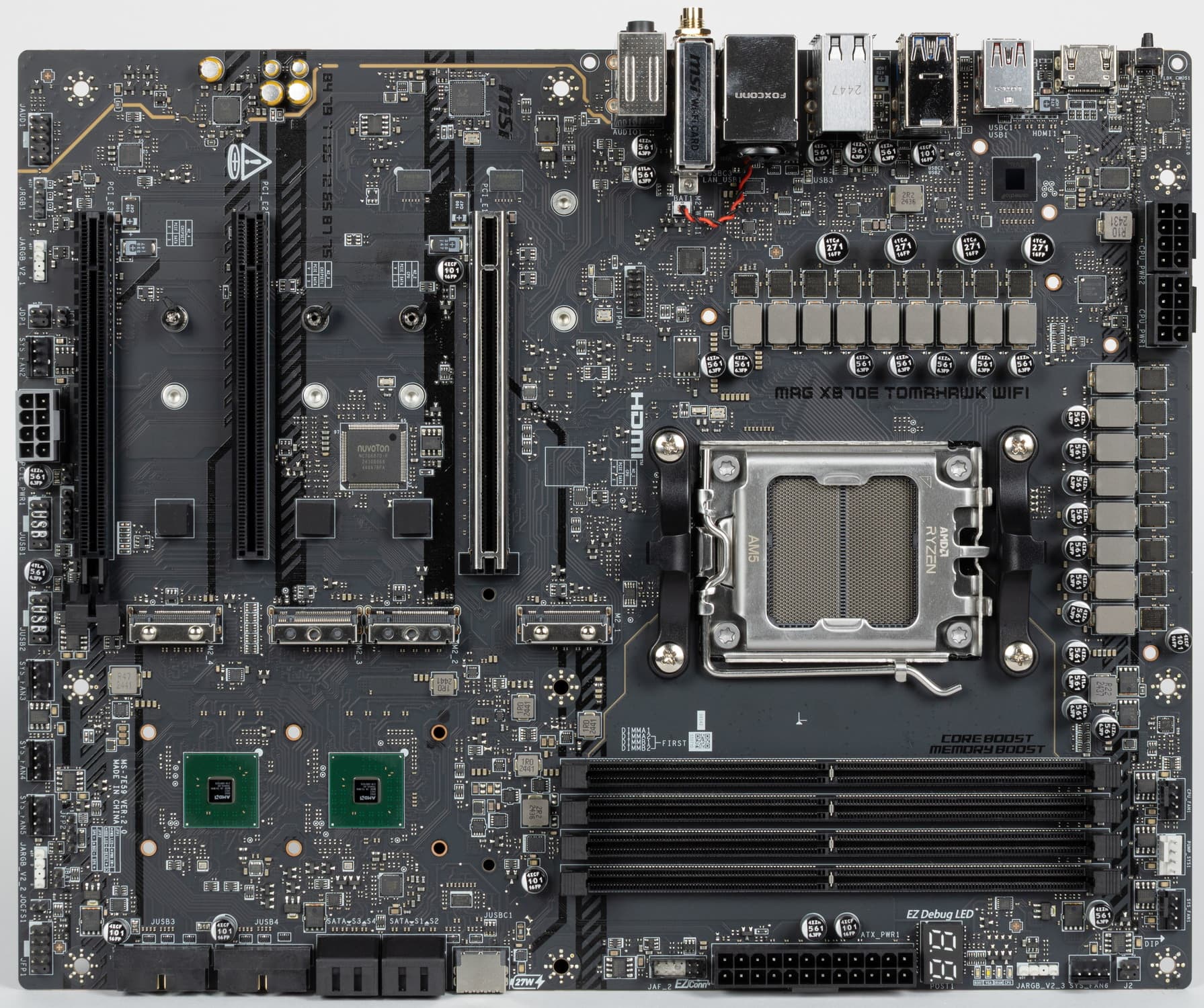 У платы 21 порт USB разных видов, включая 2 USB4, один USB 3.2 Gen2×2 в виде внутреннего порта Type-C и 8 портов USB 3.2 Gen2/1. Также она предлагает слот PCIe х16, получающий от процессора 16 линий PCIe 5.0, слот PCIe x1 (чипсетный) и третий «длинный» слот, работающий в режиме x4 (чипсетный). У платы 4 слота M.2, два из которых подключены напрямую к процессору линиями PCIe 5.0 (слот M.2_2 делит ресурсы с хабом USB4). Два других слота М.2 подключены к чипсету X870E линиями PCIe 4.0.