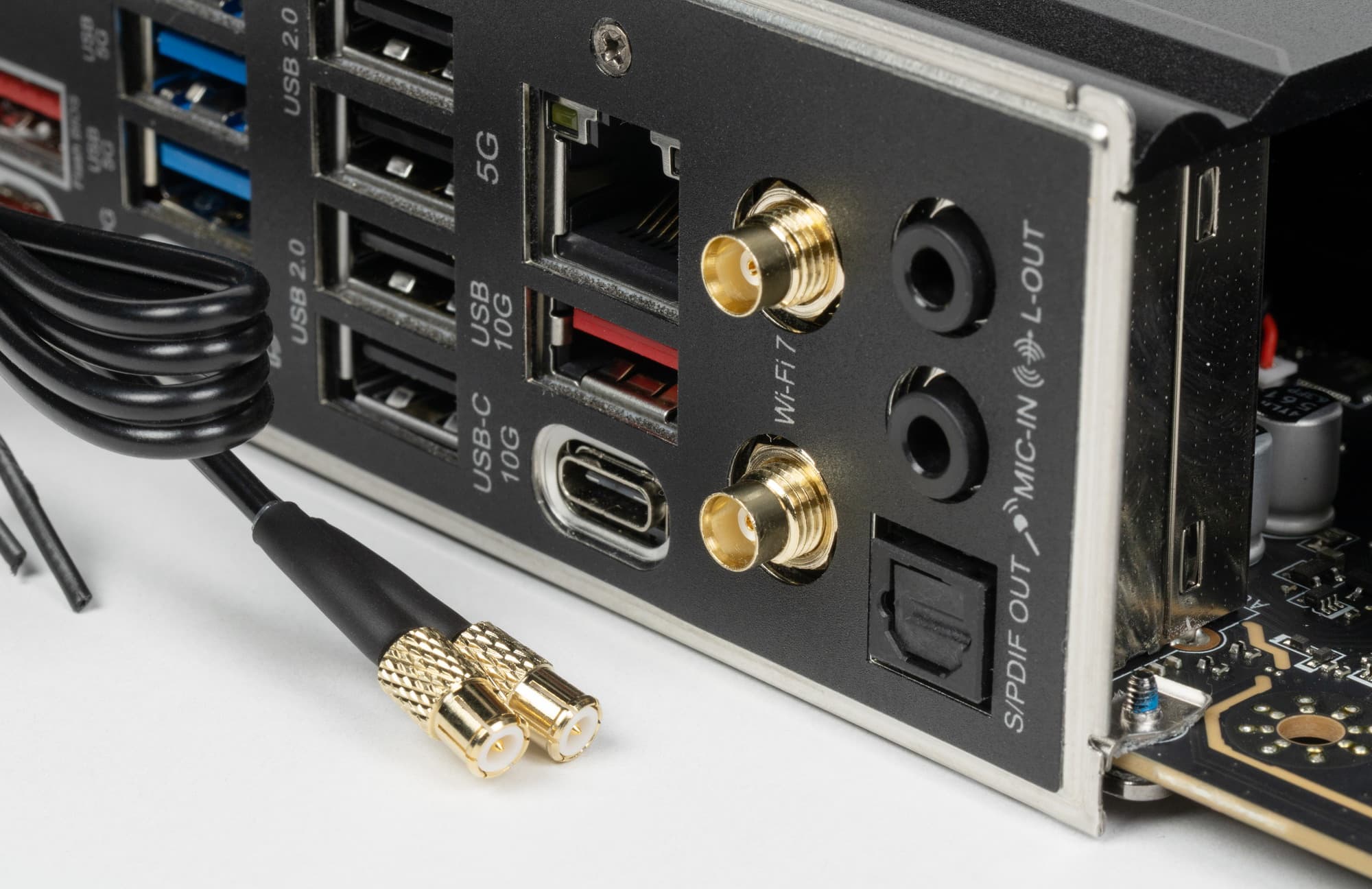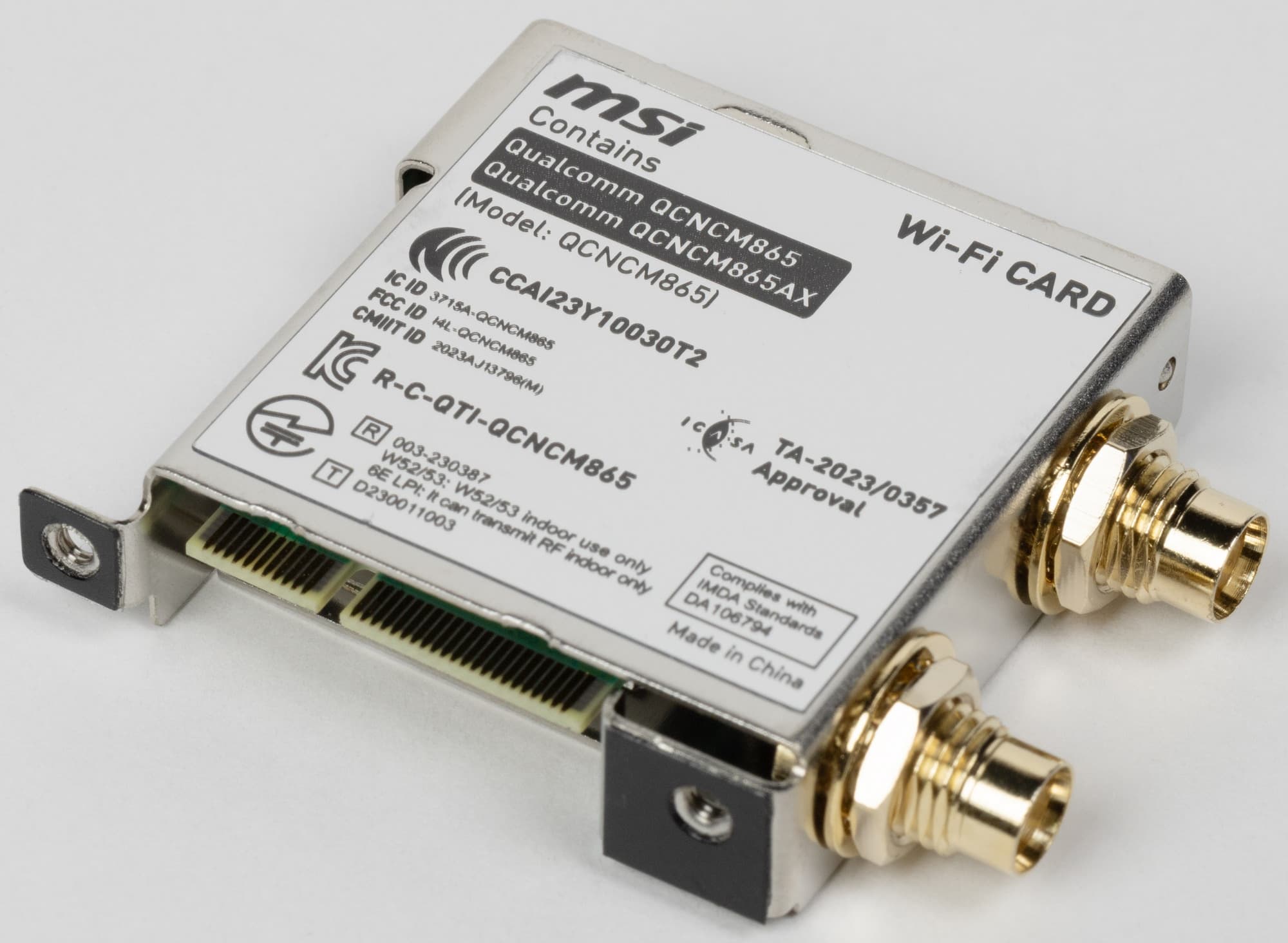 Имеется и комплексный беспроводной адаптер на контроллере Qualcomm QCNCM865, через который реализованы Wi-Fi 7 (802.11a/b/g/n/ac/ax/be, 2,4/5/6 ГГц) и Bluetooth 5.4. Он установлен в слот M.2 (E-key), и его разъемы для выносных антенн выведены на заднюю панель.
