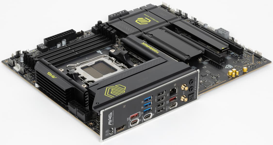 Форм-фактор ATX имеет размеры до 305×244 мм, а E-ATX — до 305×330 мм. Материнская плата MSI MAG X870E Tomahawk WiFi имеет размеры 305×244 мм, поэтому выполнена в форм-факторе ATX, и на ней имеются 9 монтажных отверстий для установки в корпус.