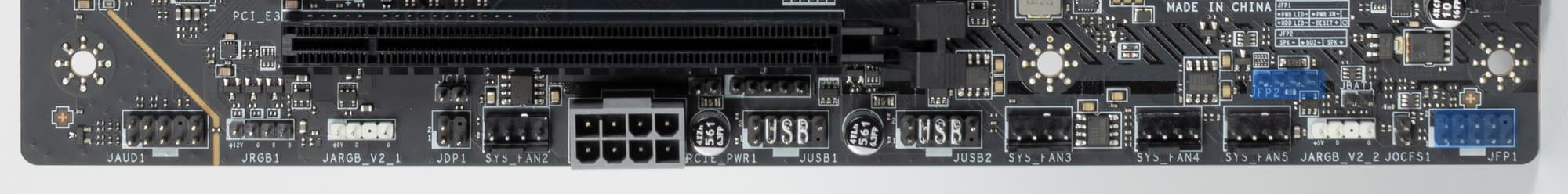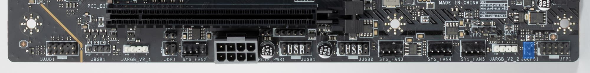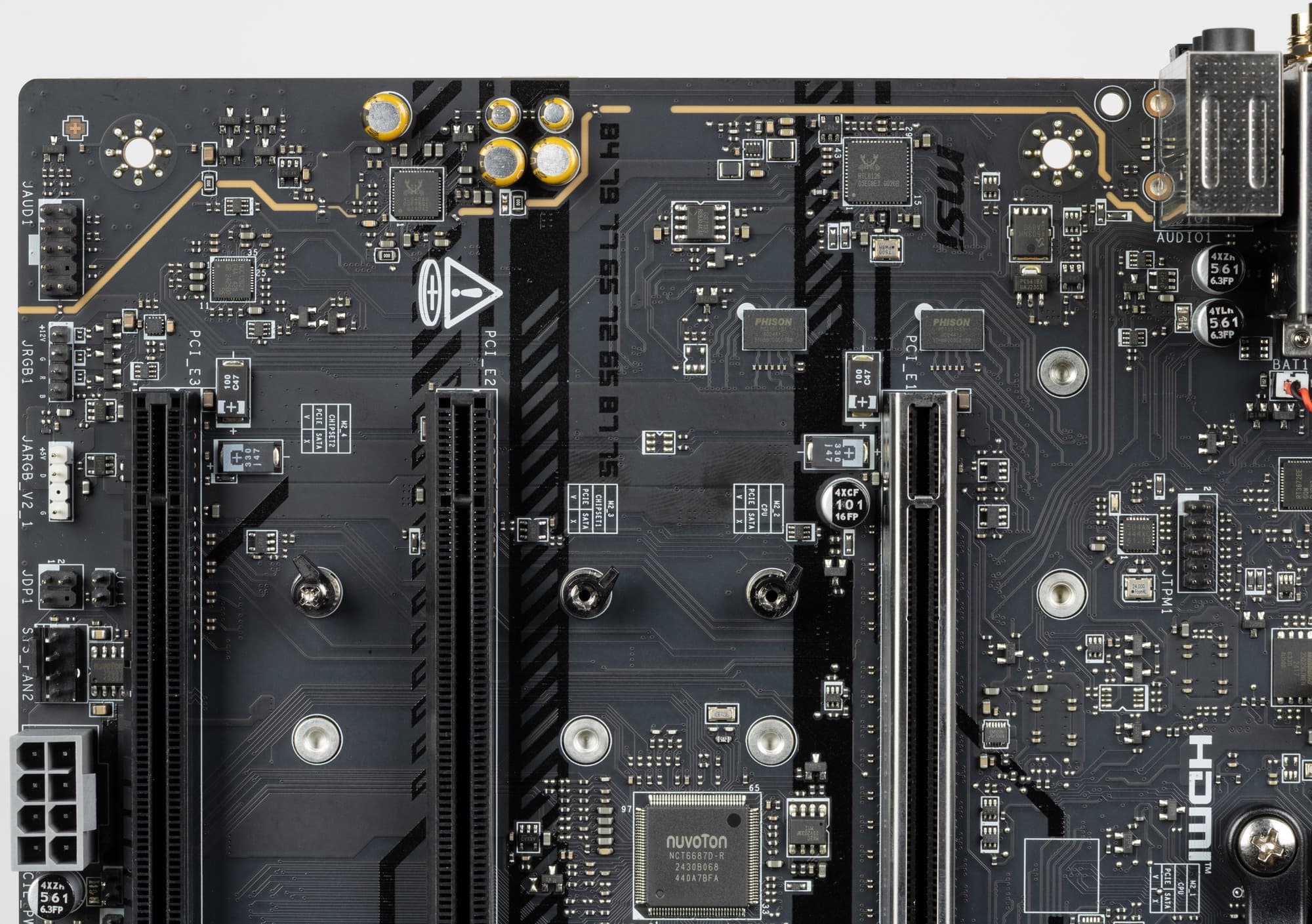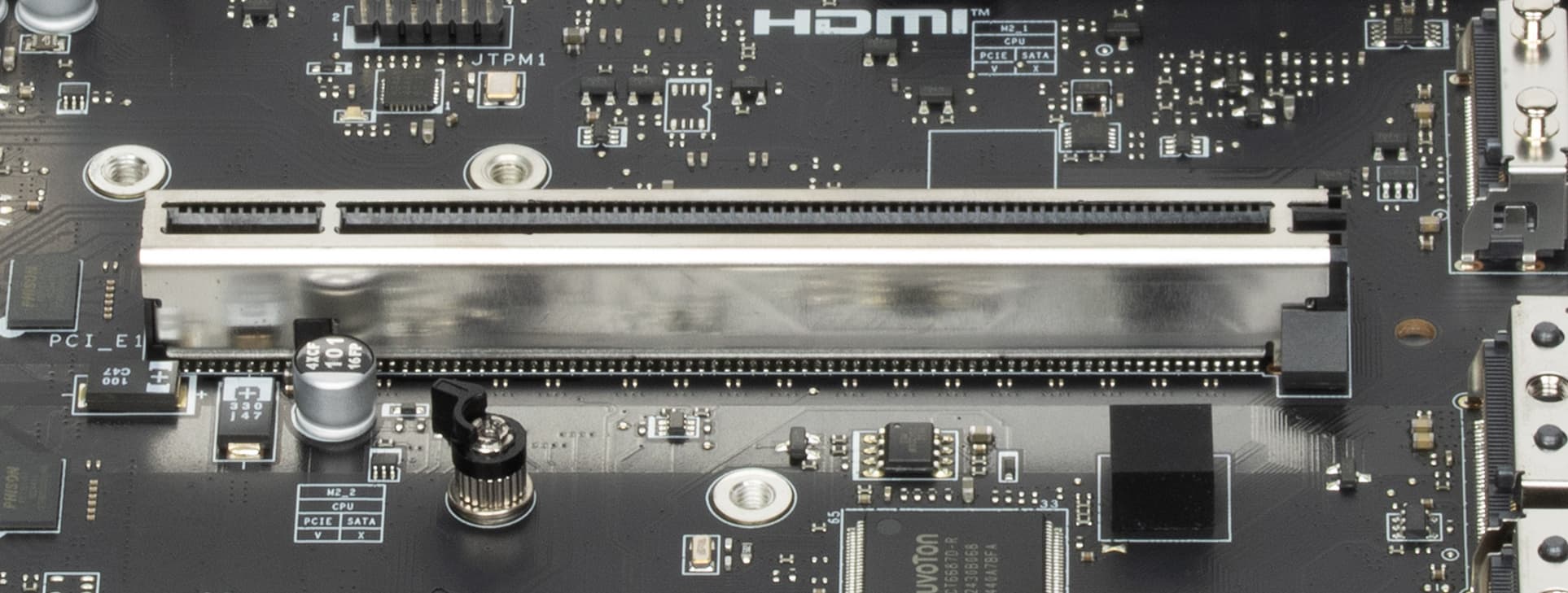Всего на плате есть 3 слота: первый PCIe x16 (PCI_E1 для видеокарт или других устройств), второй PCIe x1 (PCI_E2, имеющий 1 линию PCIe 3.0) и третий «длинный» PCIe x16 (PCI_E3, но фактически имеющий 4 линии PCIe 4.0).