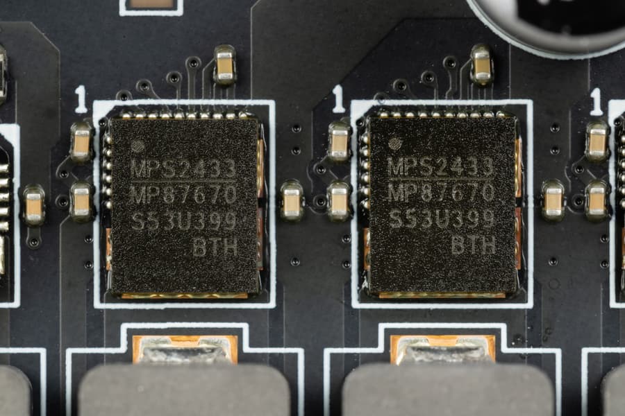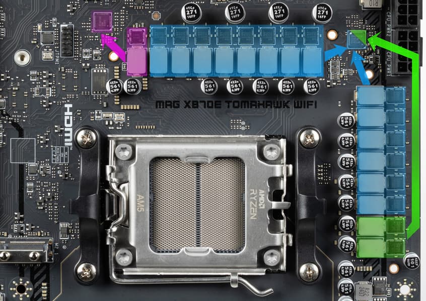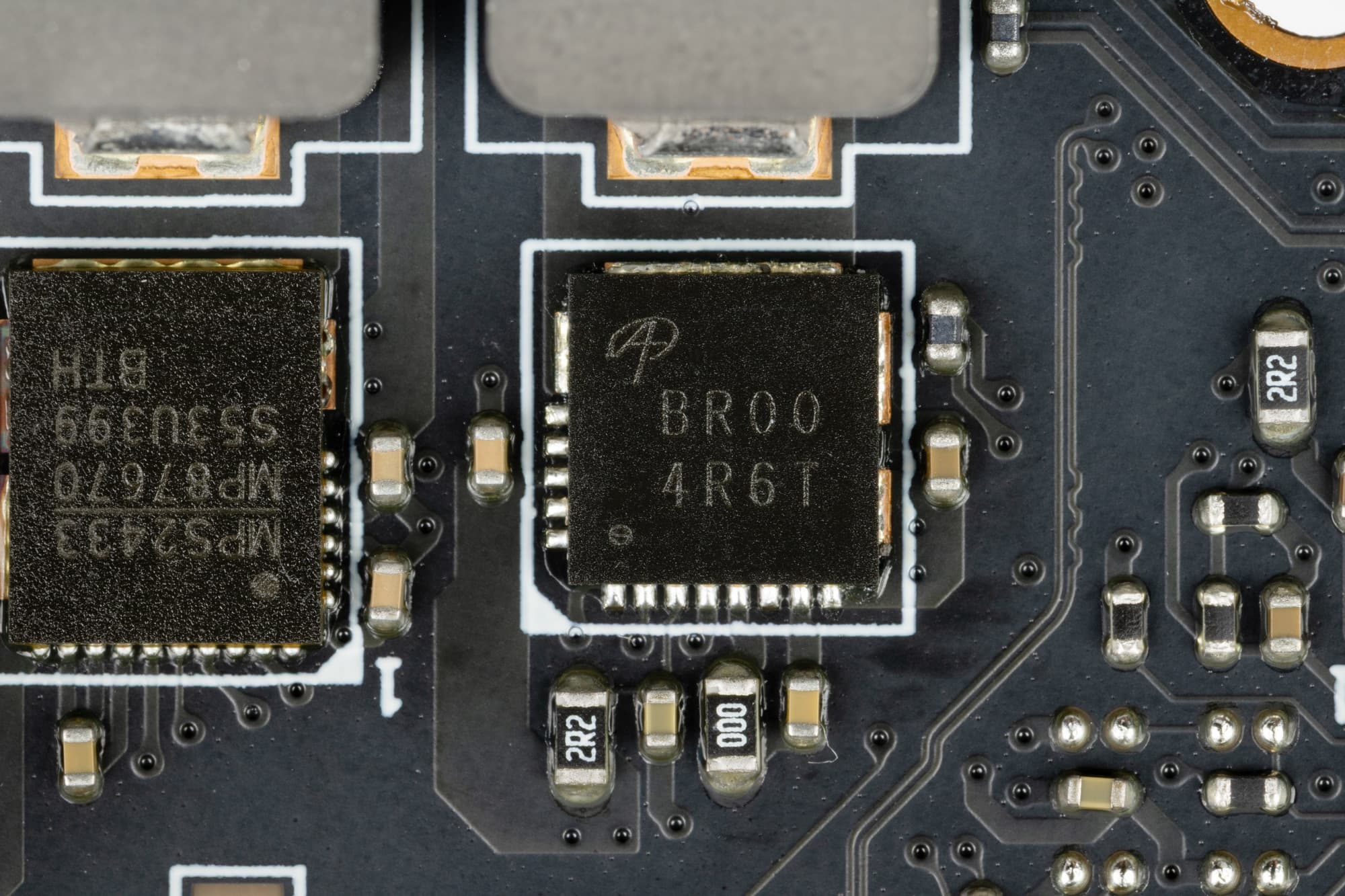 Каждый канал фазы VCore и SoC имеет суперферритовый дроссель и MP87670 DrMOS от MPS на 80 А.
