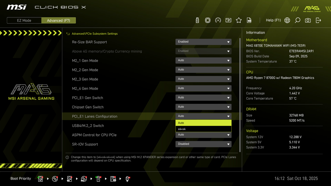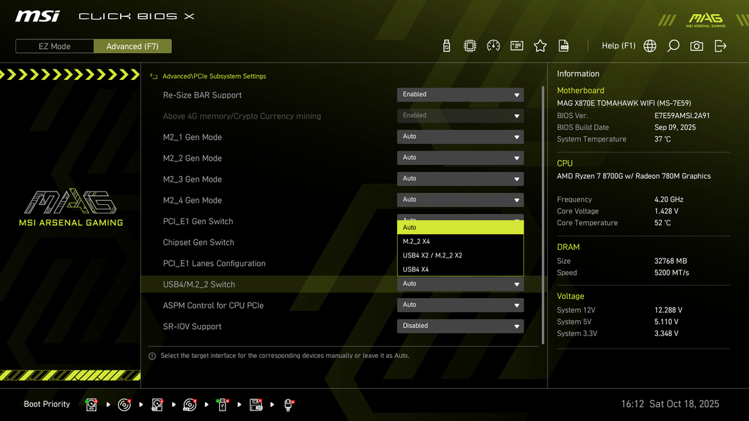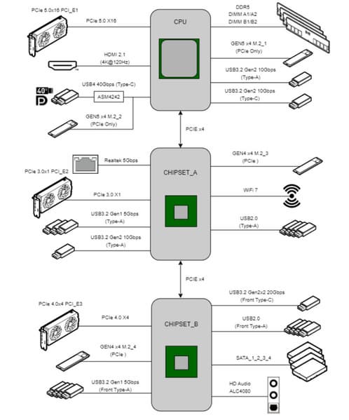 Из этой общей суммы следует минусовать 4 линии PCIe 4.0 для обеспечения хаба USB4 – ASMedia ASM4242 (по усмотрению производителя матплат эти линии могут быть взяты или у CPU, или у X870E).