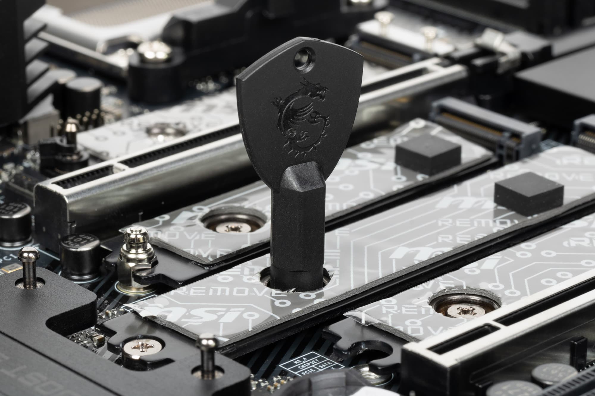 У всех слотов M.2 имеется удобный способ крепления накопителей через установленные на стойках поворотные замки.