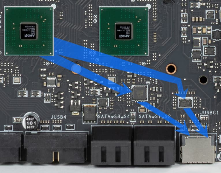 Итак, кроме USB-портов, к которым мы подойдем позже, чипсет X870E обладает 20 PCIe линиями (плюс 4 линии на аплинк с процессором). Считаем, сколько линий уходит на поддержку (связь) с тем или иным элементом: