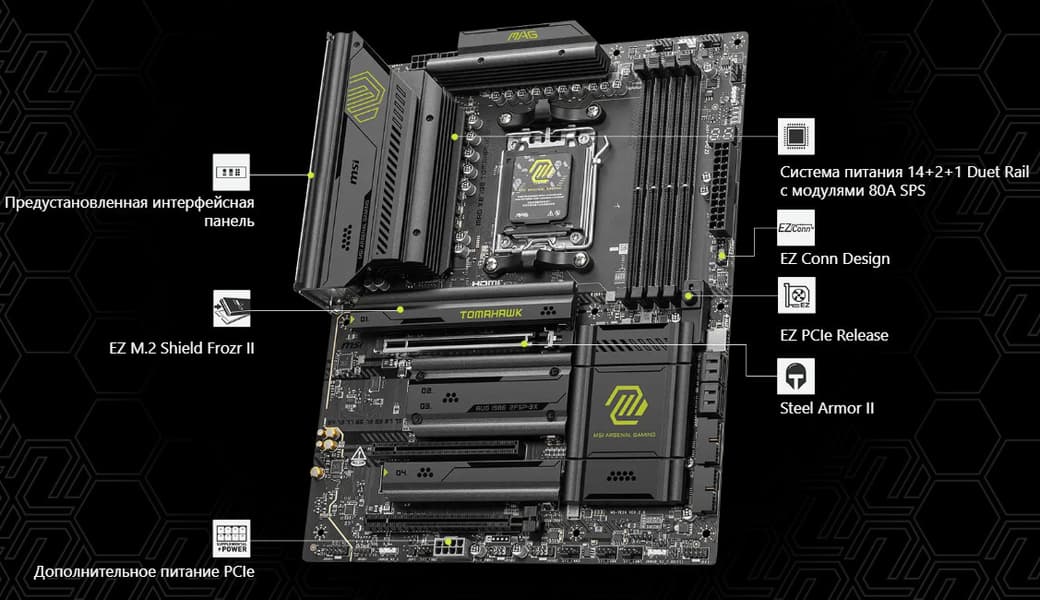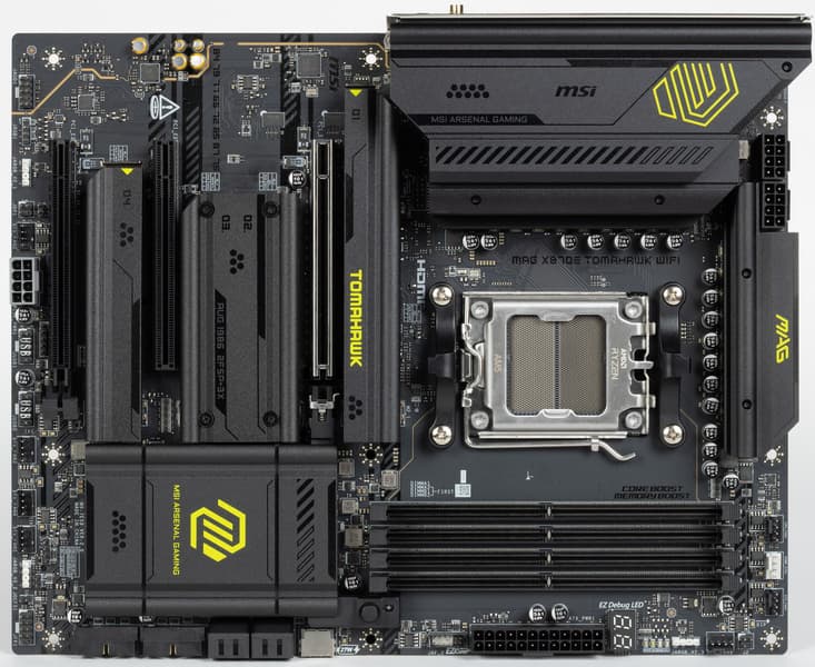 MSI MAG X870E Tomahawk WiFi относится к игровой серии плат MAG, плата основана на топовом чипсете AMD X870E и позиционируется для работы с топовыми процессорами AMD платформы AM5. Это решение для игровых ПК относительно высокого уровня, но его цену можно условно считать средней, учитывая, что за флагманы просят под сотню тысяч. Плата подойдет пользователям, не предъявляющим особых требований к ее внешнему виду.