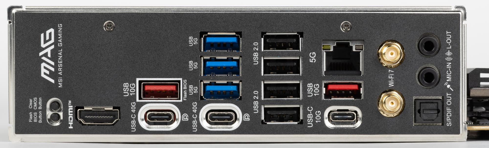 | Разъемы на задней панели | 2 × USB4 (Type-C) 2 × USB 3.2 Gen2 (Type-A) 3 × USB 3.2 Gen1 (Type-A) 1 × USB 3.2 Gen2 (Type-C) 4 × USB 2.0 (Type-A) 1 × RJ-45 2 аудиоразъема типа миниджек 1 × оптический S/PDIF (выход) 1 × HDMI (выход) 2 антенных разъема кнопка сброса CMOS кнопка перепрошивки BIOS — Flash BIOS |