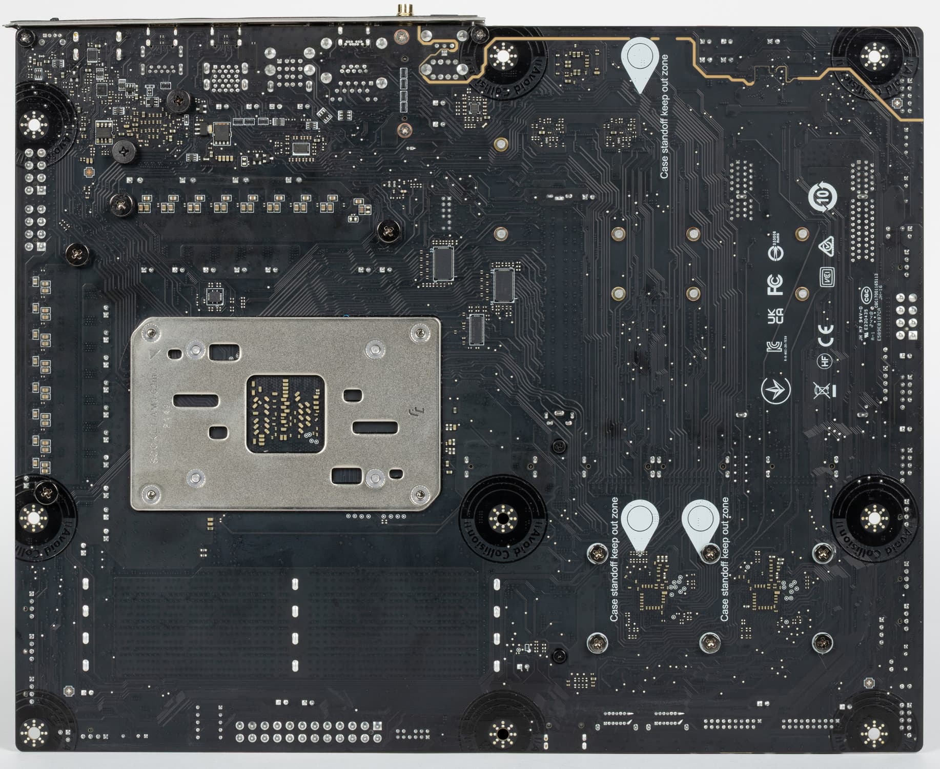 На тыльной стороне платы отмечены места, в которых при установке материнки в корпус могут быть установлены стойки, чтобы перед монтажом сборщик мог внимательно проверить минимальное количество нужных стоек. А также вокруг крепежных отверстий имеются зоны, подверженные потенциальному повреждению при неудачной установки платы в корпус, но при этом это не скажется на работоспособности матплаты.