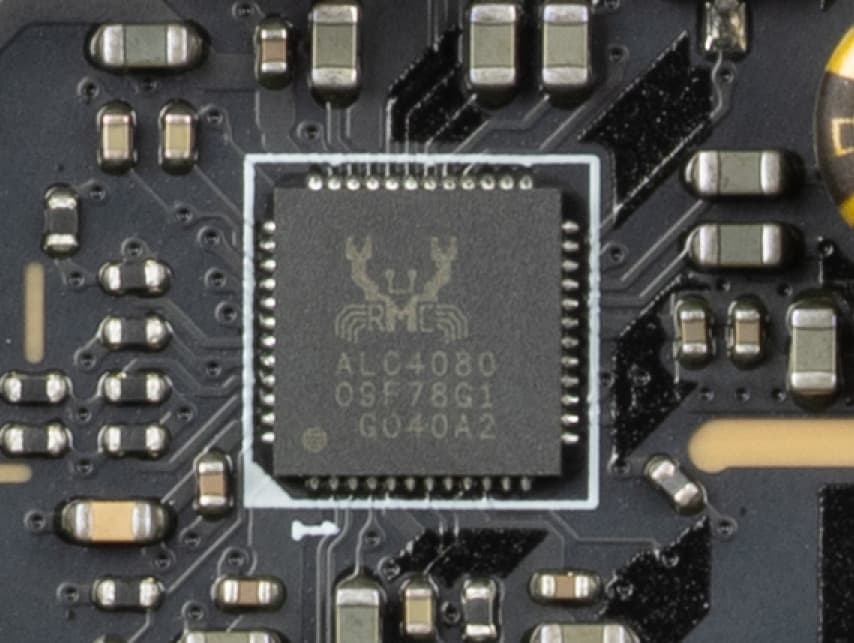 В данном случае плата оснащена аудиоподсистемой, где звуком заведует аудиокодек Realtek ALC4080, он целом обеспечивает вывод звука по схемам до 7.1 с разрешением до 32 бит /384 кГц. Не забываем, что для работы такого кодека требуются сигнальные линии USB 2.0.