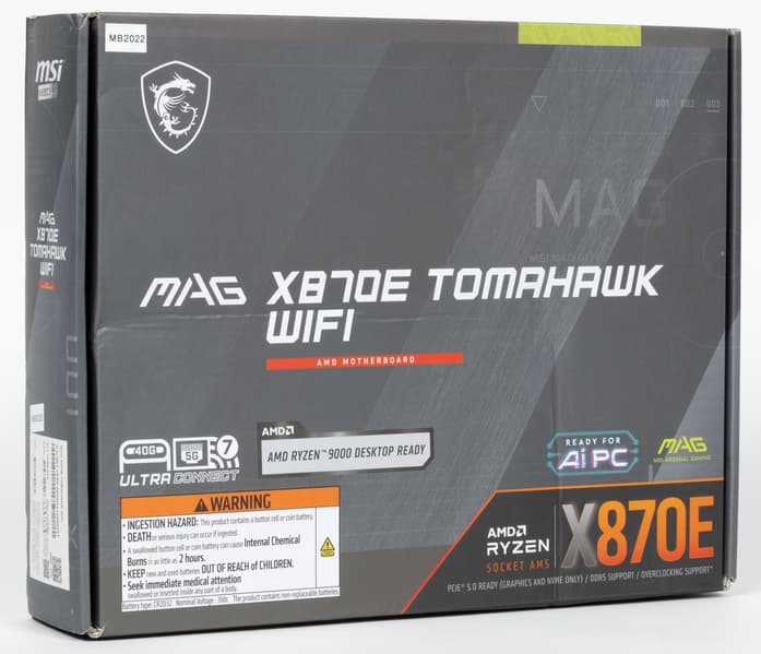 MSI MAG X870E Tomahawk WiFi поставляется в традиционной коробке фирменного дизайна серии MAG. Комплект размещен под платой в отдельных отсеках.