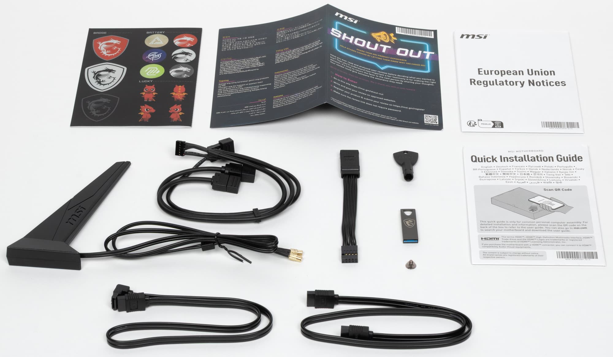 Надо отметить, что комплект поставки для такой платы неплох: кроме традиционных элементов типа краткого руководства пользователя и кабелей SATA, имеются антенна встроенного Wi-Fi-модуля, фирменный адаптер для удобного подключения проводов от корпуса к матплате (он выполнен в виде небольшого кабеля), бонусные стикеры, ключ для смены держателей в слотах M.2, адаптер для подключения СО от MSI через проприетарное гнездо JAF, накопитель с ПО.