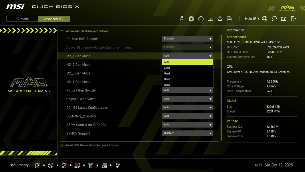 Выше я вел речь про первый PCIe x16 (PCI_E1), подключенный к процессору. Второй PCIe x1 (PCI_E2) работает в режиме х1 (PCIe 3.0), а третий PCIe x16 (PCI_E3) работает в режиме x4 (PCIe 4.0). Два последних подключены к X870E.
