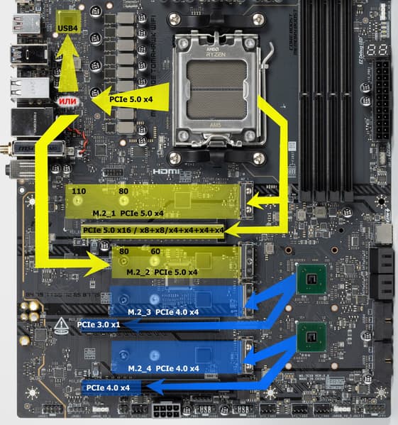 - 4 линии PCIe 5.0 делятся между хабом USB4 ASMedia ASM4242 и слотом M.2_2. Варианты: