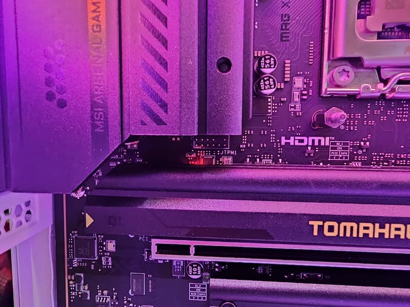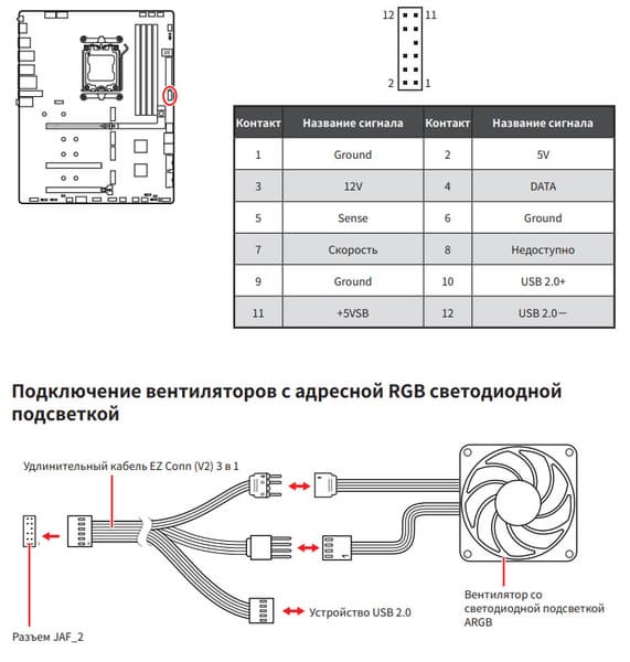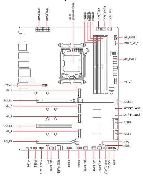 | Прочие внутренние элементы | 24-контактный разъем питания ATX 2 8-контактных разъема питания EPS12V 1 8-контактный разъем питания PCIe 1 слот M.2 (E-key), занят адаптером беспроводных сетей 1 разъем для подключения порта USB 3.2 Gen2x2 Type-C 2 разъема для подключения 4 портов USB 3.2 Gen1 2 разъема для подключения 4 портов USB 2.0 8 разъемов для подключения 4-контактных вентиляторов и помп ЖСО 3 разъема для подключения адресуемой ARGB-ленты 1 разъем для подключения неадресуемой RGB-ленты 1 разъем аудио для передней панели корпуса 1 разъем для сброса CMOS 1 разъем для проприетарных вентиляторов MSI 1 разъем для систем безопасности TPM 2 разъема для подключения управления с передней панели корпуса |