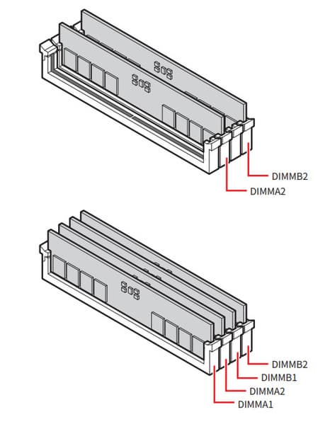 Для установки модулей памяти на плате имеется четыре DIMM-слота (для работы памяти в Dual Channel в случае использования всего 2 модулей их следует устанавливать в А2 и B2).