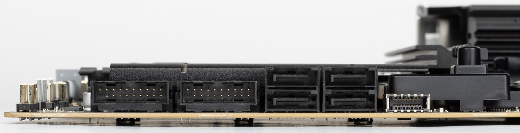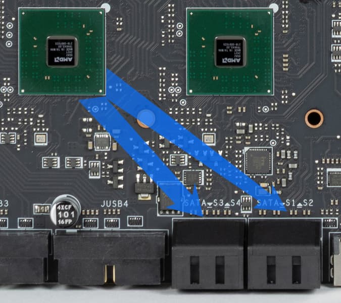 Всего у платы 4 разъема Serial ATA 6 Гбит/с + 4 слота для накопителей в форм-факторе M.2. 4 порта SATA 1,2,3,4 реализованы через чипсет X870E и поддерживают создание RAID.