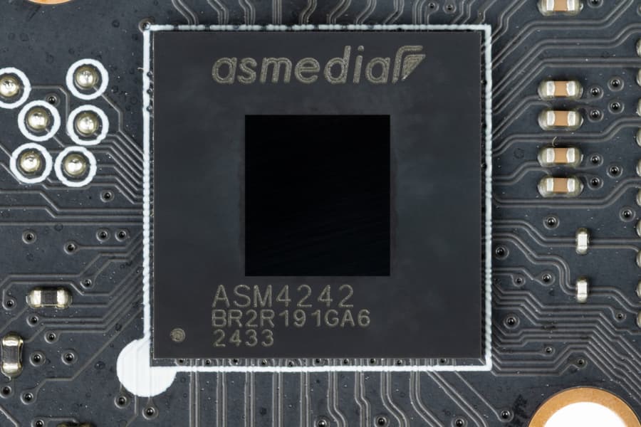 - 2 порта USB4: оба реализованы с помощью хаба ASMedia ASM4242 (на него потрачены 4 линии PCIe 5.0 от CPU, не забываем, что хаб делит линии со слотом M.2_2) и представлены двумя портами Type-C на задней панели;