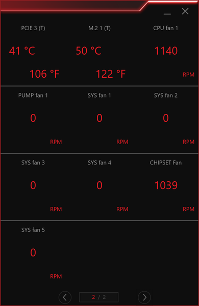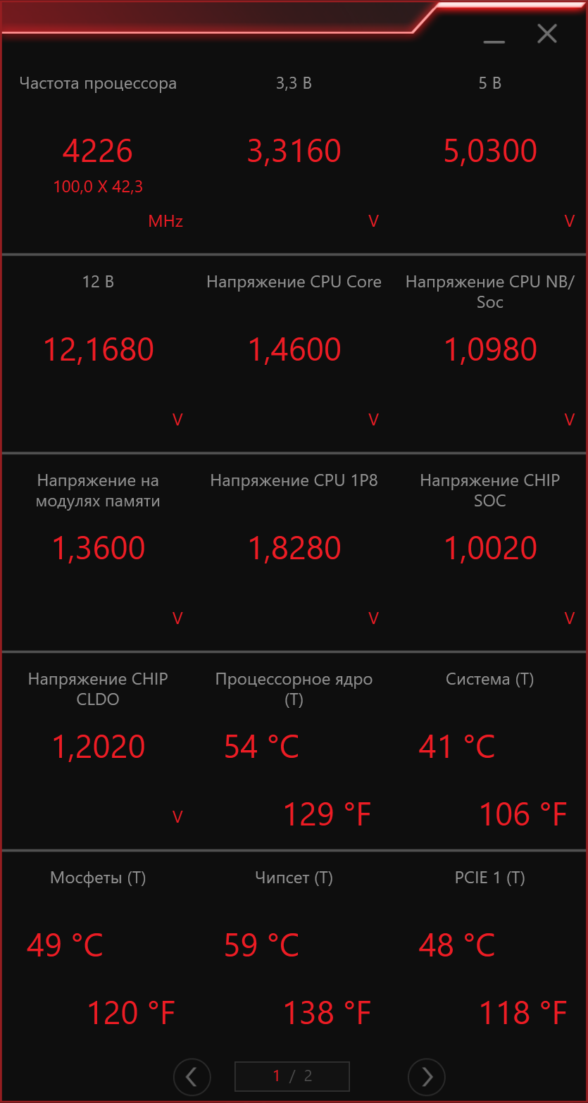 В результате получаем вот такое окно, которое можно переключать, если количество отмеченных в мониторинге элементов не умещается в нем. Это окно весьма удобно разместить где-то сбоку для удобства просмотра ситуации с «железом», например, в случае разгона или серьезной нагрузки в игре. Правда тогда придется отказаться от режима «полного экрана» в той же игре. В режим On-Screen-Display (OSD) окно мониторинга не переключается.
