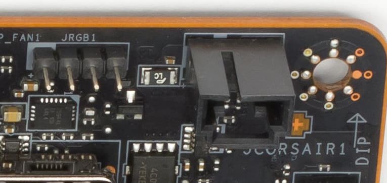 Если уж мы заговорили о световых индикаторах, то надо упомянуть и возможности материнской платы по подключению RGB-подсветки. Имеется три разъема для подключения любых устройств этого плана: 2 разъема для подключения адресуемых (5 B 3 A, до 15 Вт) RGB-лент/устройств, 1 разъем неадресуемых (12 В 3 А, до 36 Вт) RGB-лент/устройств. Сверху на плате имеется неадресуемый разъем 12 В. Компания MSI очень активно сотрудничает с Corsair, поэтому для их элементов подсветки есть специальный проприетарный разъем (он рядом с JRGB1).