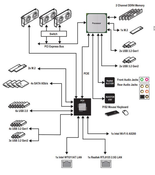 | Сетевые контроллеры | 1 × Intel WGI211AT (Ethernet 1 Гбит/с) 1 × Realtek RTL8125 (Ethernet 2.5 Гбит/с) 1 × Intel Dual Band Wireless AX200NGW/CNVi (Wi-Fi 802.11a/b/g/n/ac (2,4/5 ГГц) + Bluetooth 5.0) |
