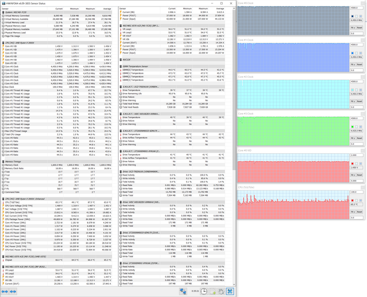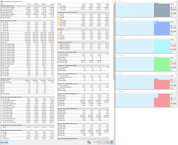 Запускал ряд игр: Shadow Of The Tomb Raider, Metro Exodus, выставляя настройки графики на минимум, на средний уровень. Также запускал тесты 3DMark (указанные выше). Картина сильно поменялась: частоты работы ядер выросли, достигали почти 4,5 ГГц, загрузка процессора была высокой, однако всего по 4-8 ядрам (второй блок CCD1 не оптимизировался), остальные почти простаивали, поэтому в целом нагрев был не слишком высок. При этом все же Ryzen Master не позволил поднять частоты выше.