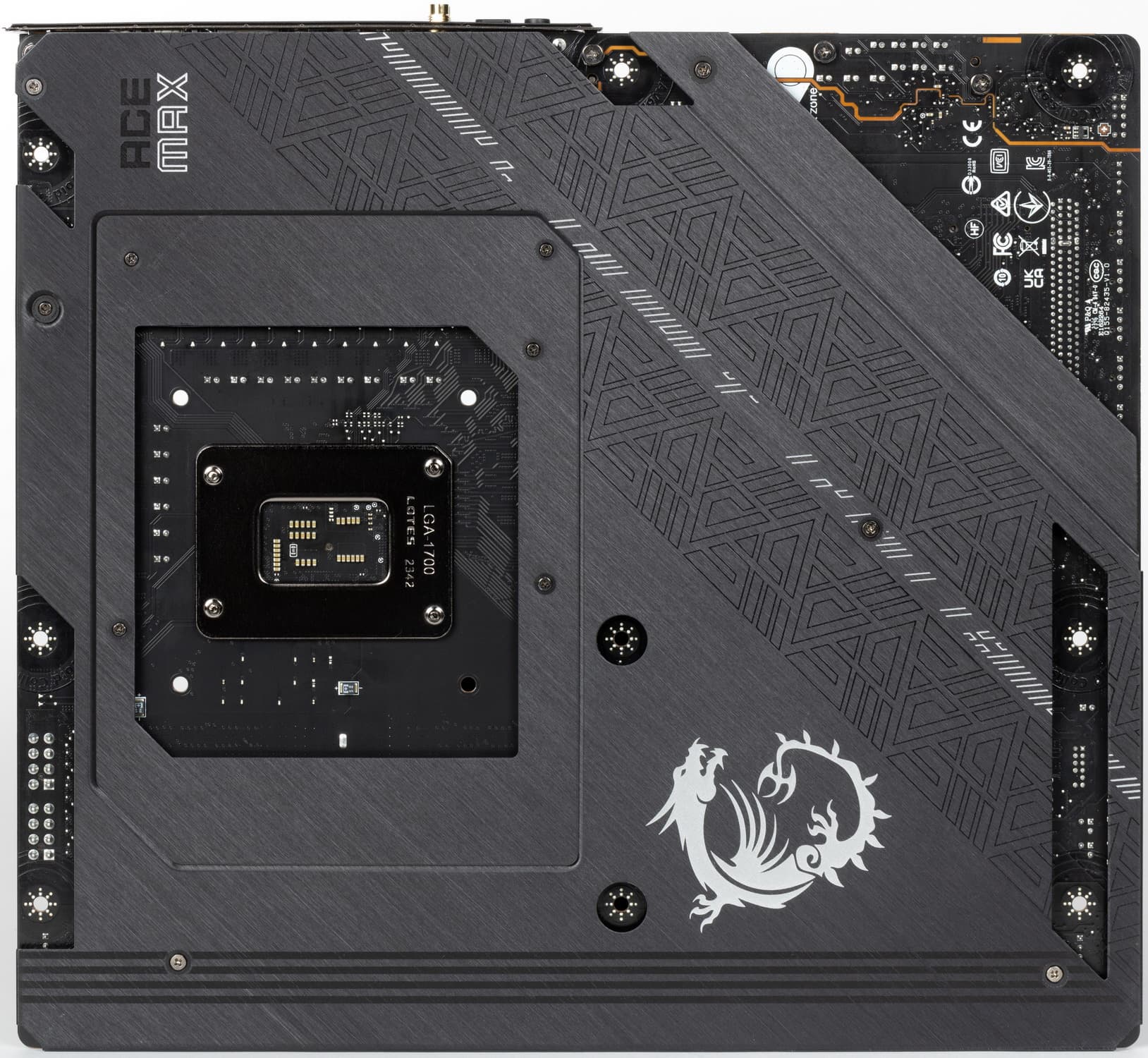 Форм-фактор ATX имеет размеры до 305×244 мм, а E-ATX — до 305×330 мм. Материнская плата MSI MEG Z790 Ace Max имеет размеры 305×277 мм, поэтому выполнена в форм-факторе E-ATX, и на ней имеются 9 монтажных отверстий для установки в корпус. Однако следует иметь в виду, что одно из девяти монтажных отверстий перекрыто радиатором для слота M.2.
