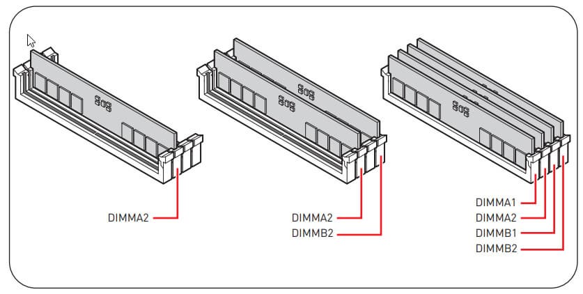 Для установки модулей памяти на плате MSI имеется четыре DIMM-слота (для работы памяти в Dual Channel в случае использования всего 2 модулей их следует устанавливать в А2 и B2.