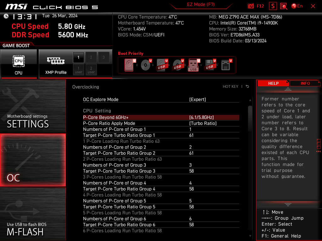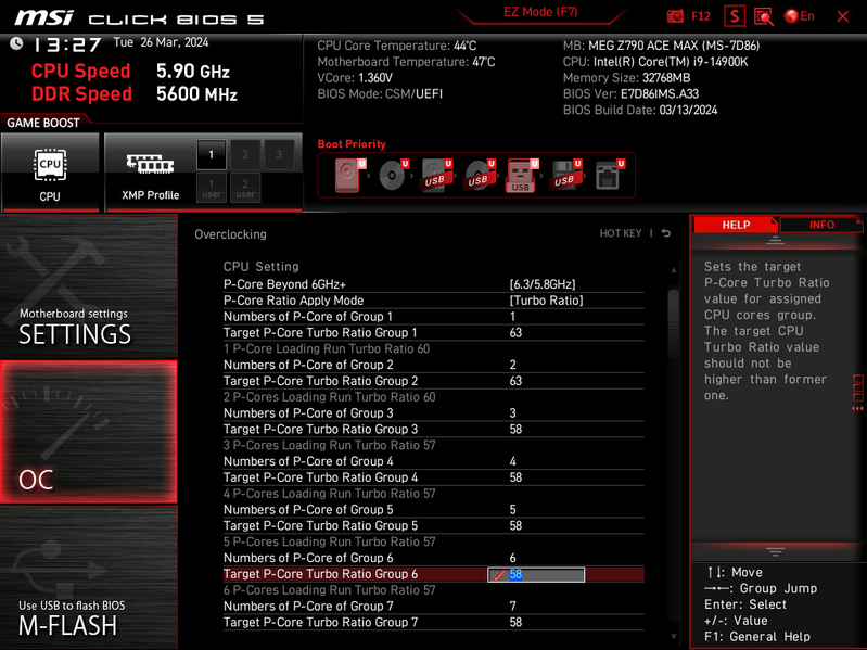 Затем, как и в случае с платой серии Godlike, вручную выставил 5,9 ГГц по всем Р-ядрам и 4,6 ГГц по всем Е-ядрам. Стресс-тесты частично проходили, частично – нет, но зависаний не было. При этом выяснилось, что при 5,8 ГГц и 4,5 ГГц все стресс тесты прошли отлично, СО отлично справлялась с пиковыми нагрузками. Нагрев уже подбирался к границе в 90 градусов, но еще имелся задел, стабильность на высоте. При этом не надо забывать, что это в условиях очень тяжелой стрессовой нагрузки на процессор! Даже самые тяжелые приложения не могут загрузить все ядра на 100% в длительном режиме. Так что, в целом, система питания у данной матплаты отличная, процессор имеет прекрасный задел на автооверклокинг.