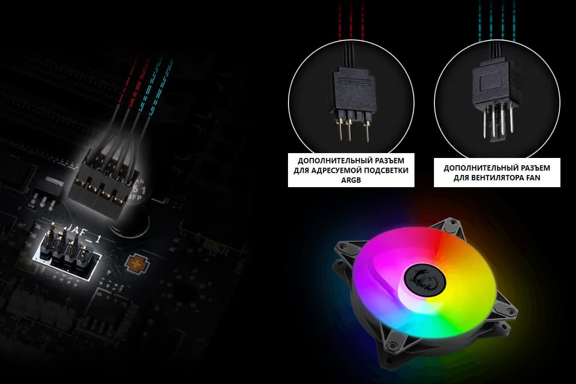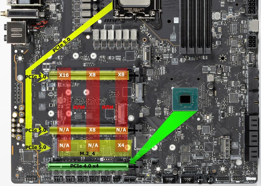 - Переключатель: или слот M.2_5 (4 линии PCIe 4.0), или порт SATA_7: максимум 4 линии PCIe 4.0;