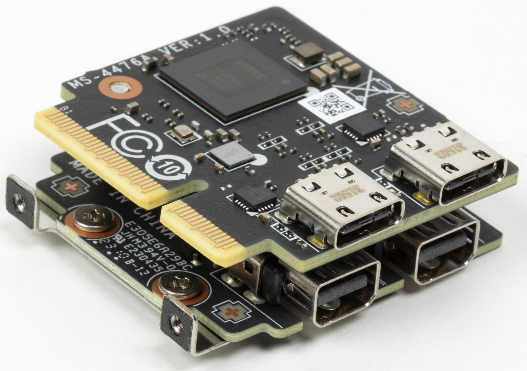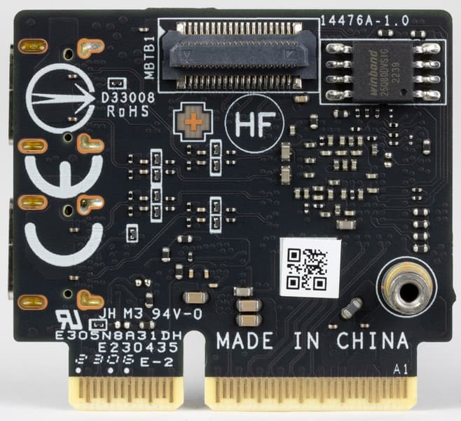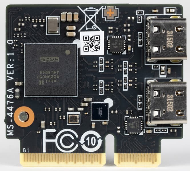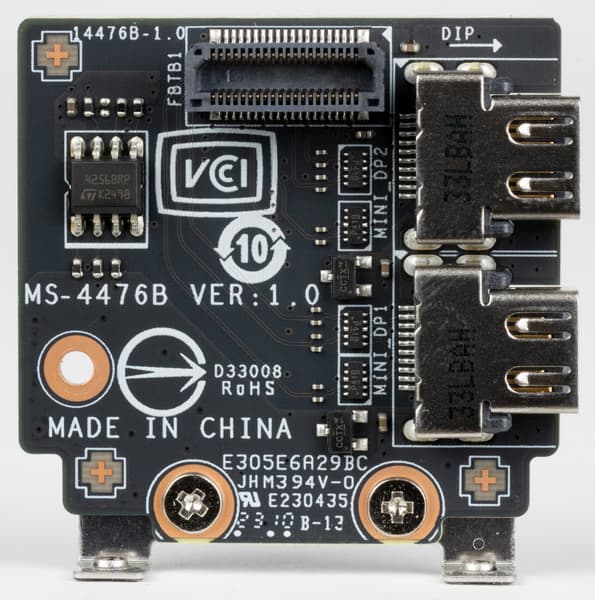 Модуль имеет 2 гнезда Type-C для вывода как через протокол TB, так и для использования в качестве USB 3.2 Gen2/1. Также модуль снабжен двумя гнездами DisplayPort (в форме mini-DP) для приема сигналов от внешних источников (видеокарты и др.), в комплект поставки входят адаптеры-переходники с полноформатных DP на мини-формат.