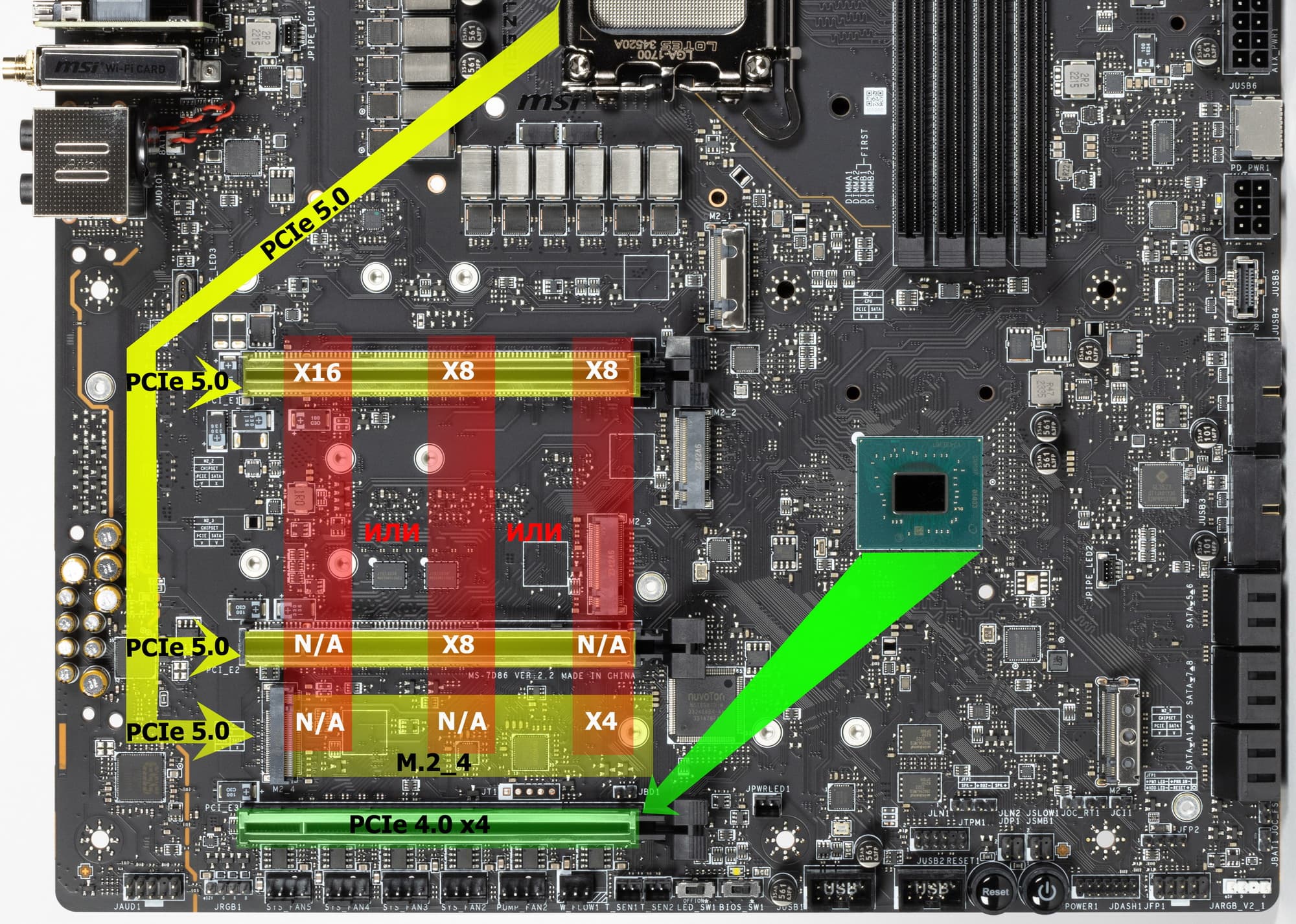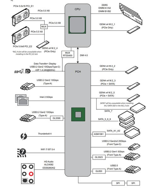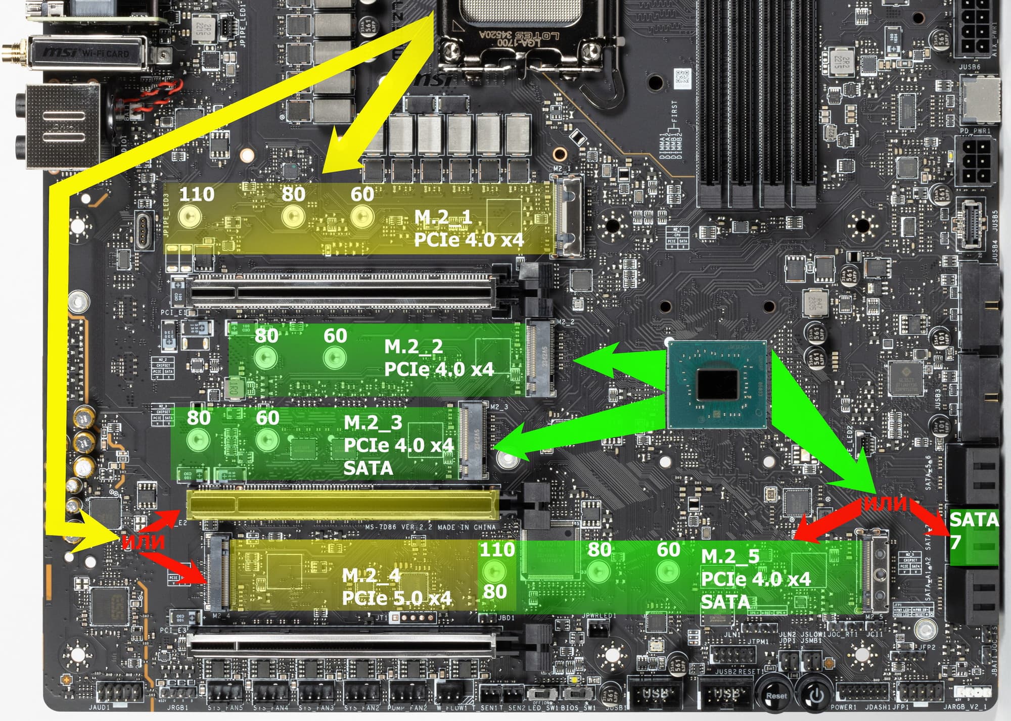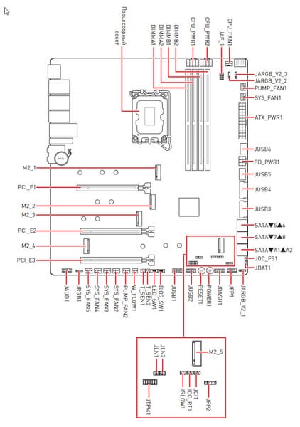 Также слот M.2_5, подключенный уже к чипсету Z790 линиями PCIe 4.0, делит их с портом SATA 7.