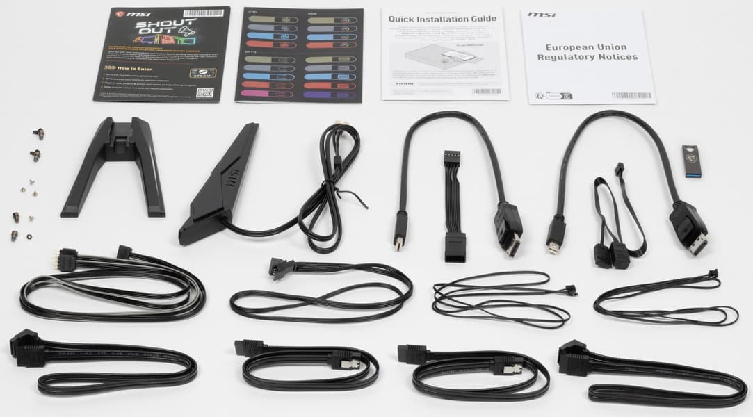 Комплект поставки соответствует топовому продукту: кроме традиционных элементов типа руководства пользователя и кабелей SATA, имеются антенна встроенного Wi-Fi-модуля, запасные поворотные замки для М.2 слотов, разветвители для подключения подсветок, 2 внешних термодатчика, 2 кабеля-переходника mini-DP-to-DP, бонусные стикеры, накопитель типа «флешки», брелок и адаптер для удобного подключения к фронтальной панели корпуса.