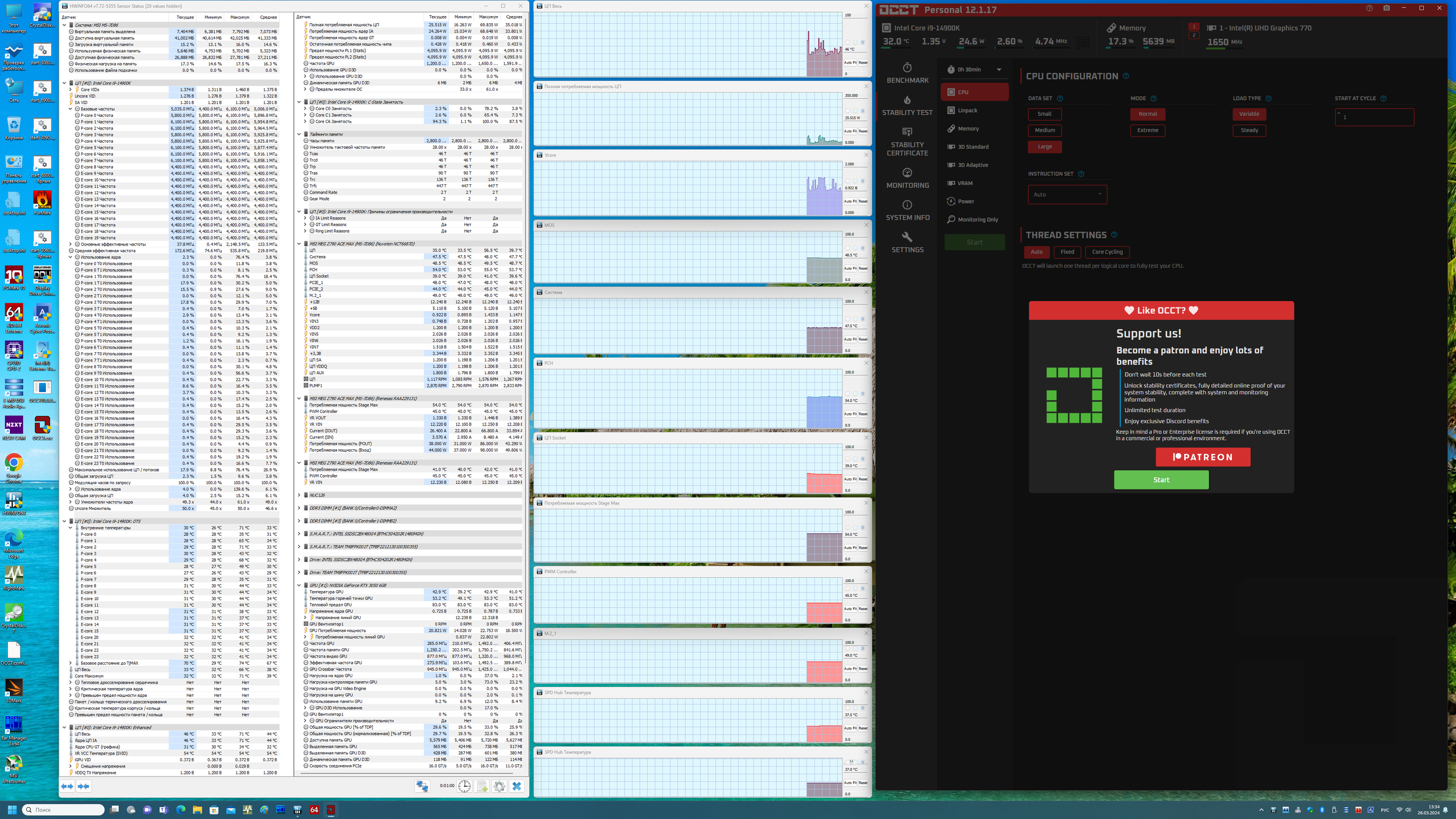 Да, это по сути стандартный уже авторазгон Core i9 14900K для материнских плат топового уровня на чипсете Z790. Именно плат с очень мощным питанием. Все остальные параметры системы по нагреву компонентов были в норме. И стоит отметить, что потребление CPU превысило 260 Вт.