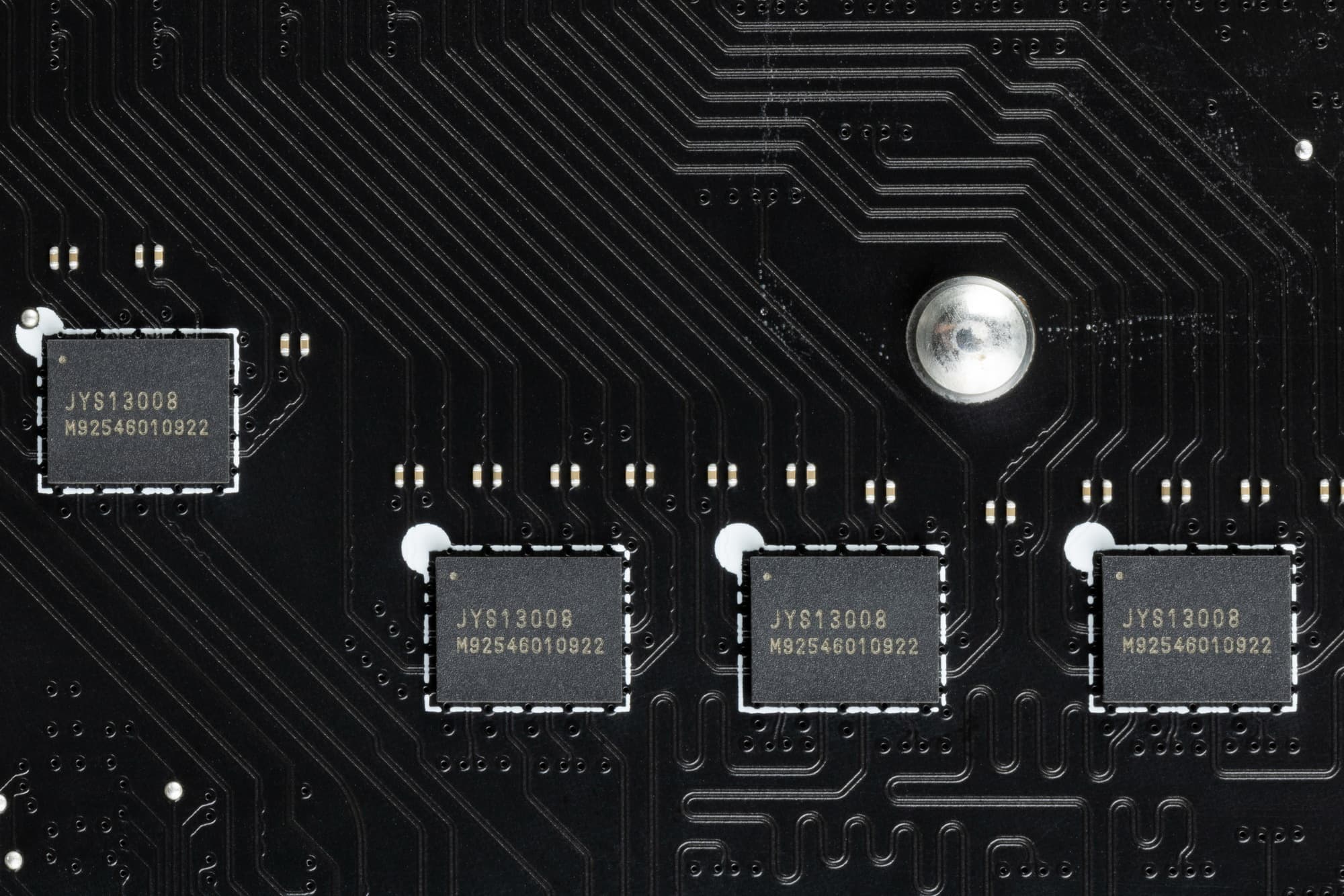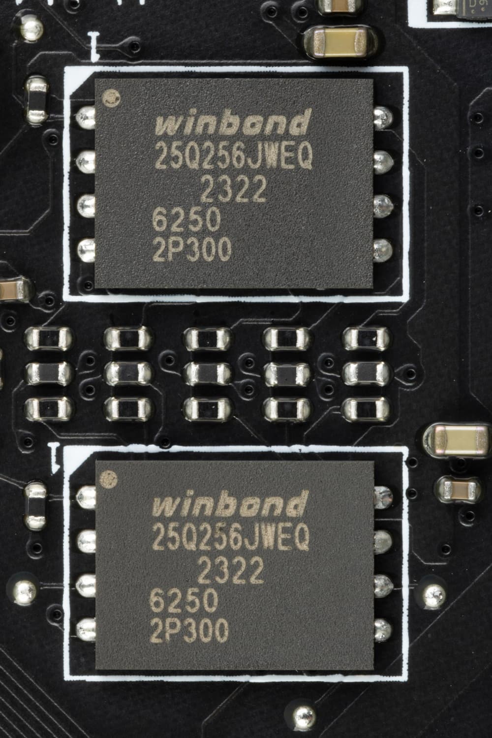 На оборотной стороне расположено несколько контроллеров и традиционная некоторая логика. Текстолит обработан хорошо: во всех точках пайки не только острые концы срезаны, но и все неплохо отшлифовано. На задней стороне установлена пластина из алюминия с наноуглеродным покрытием. Она помогает отводить тепло от задней стороны PCB через термоинтерфейс и обеспечивает жесткость материнской платы.