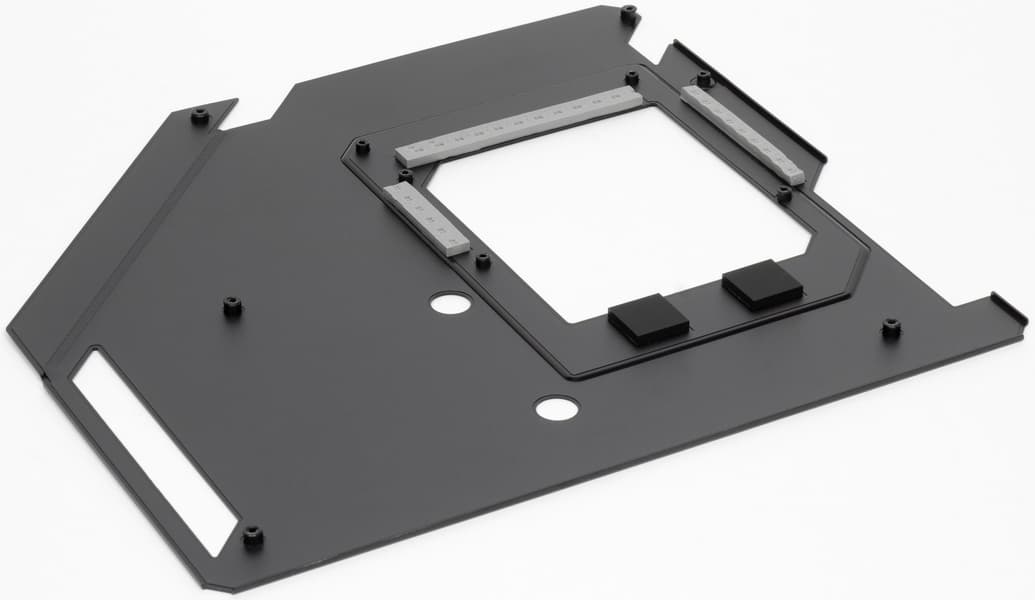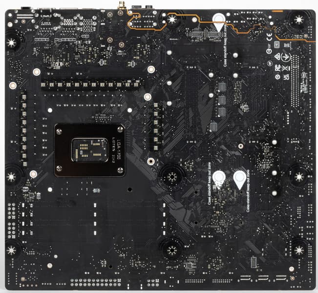 Материнская плата имеет бэкплейт, защитную пластину на оборотной стороне, которая также принимает участие в охлаждении в районе VRM через термопрокладки.