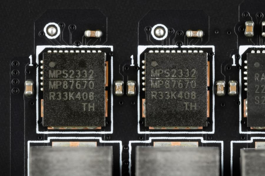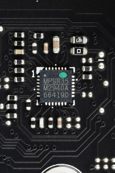 Блок VCCIO имеет свою отдельную двухфазную схему питания, управляемую ШИМ-контроллером MP2940A от Monolithic Power Systems и со сборками MP87670 (до 70 A) того же производителя.