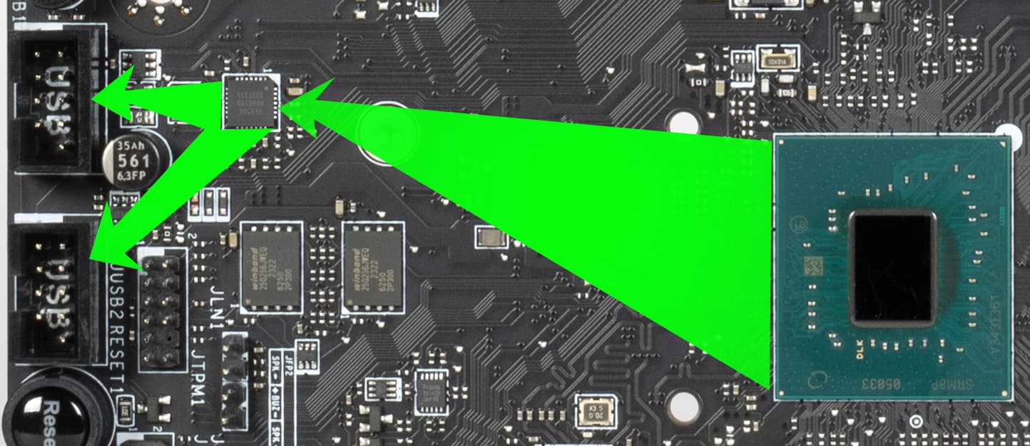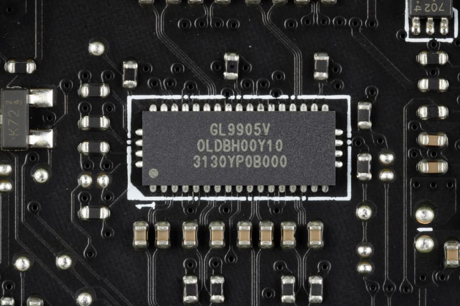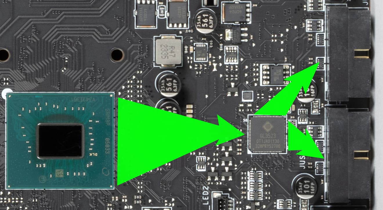 - 4 порта USB 3.2 Gen1: все реализованы через контроллер Genesys Logic GL3523 (на него потрачена 1 линия USB 2.0 от Z790) и представлены 2 внутренними разъемами на материнской плате (каждый на 2 порта);