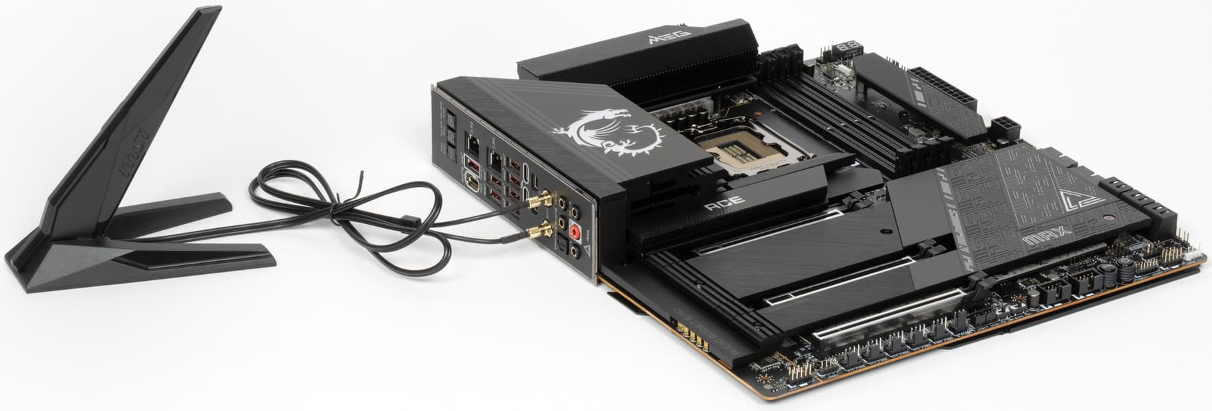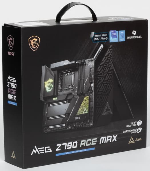 MSI MEG Z790 Ace Max поставляется в традиционной толстой черной коробке фирменного дизайна серии MEG. Комплект размещен под платой в отдельном отсеке.