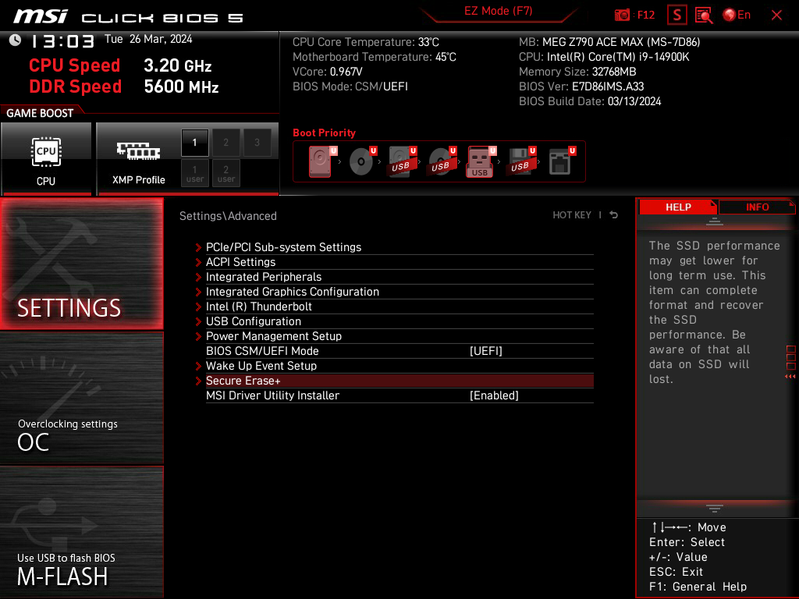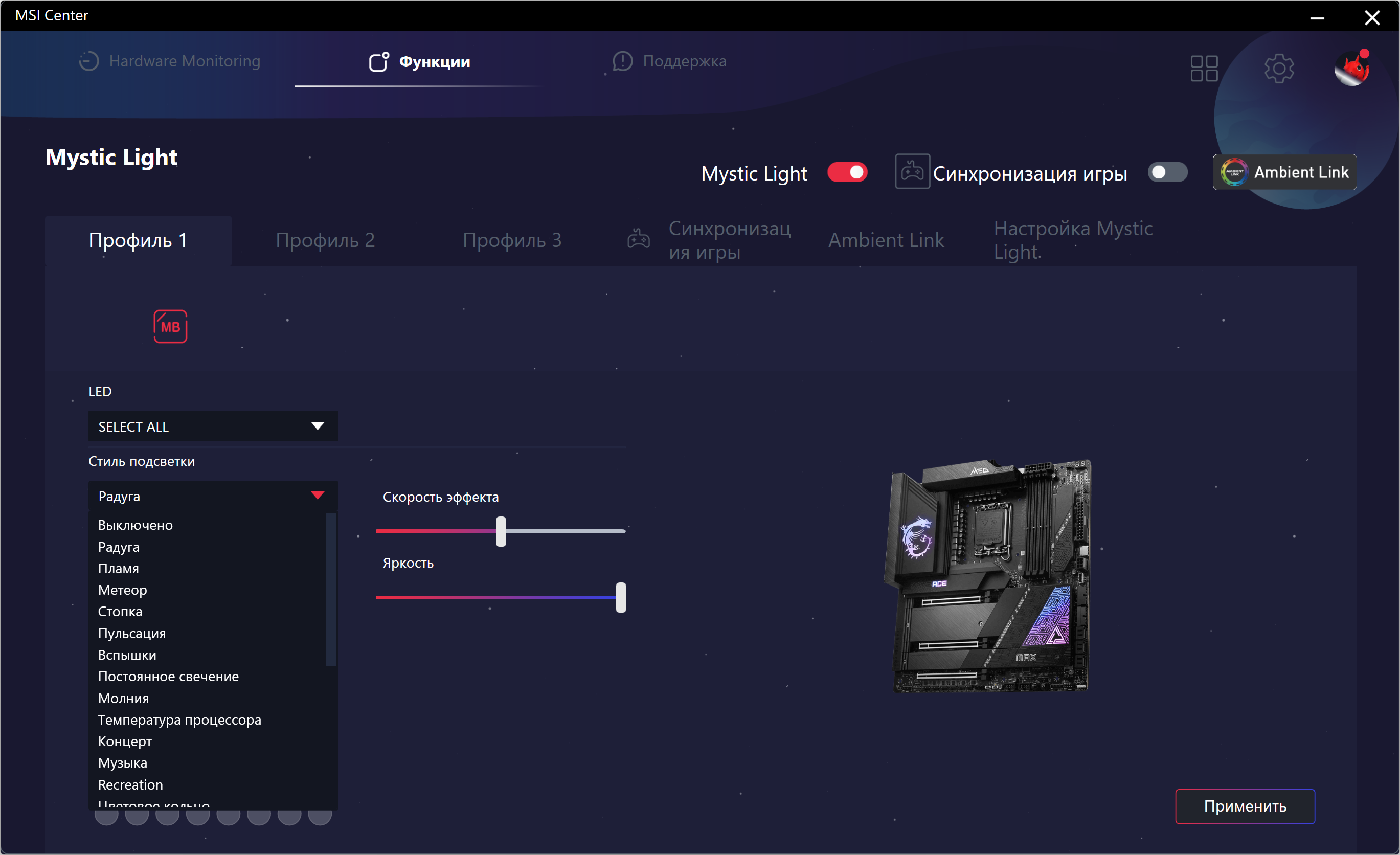 Как и любая модель из серии MEG, данная плата предлагает широкие возможности для любителей разгона в виде аппаратных «фишек», а также множество настроек в BIOS Setup и фирменных утилитах — лишь бы кулер справлялся.