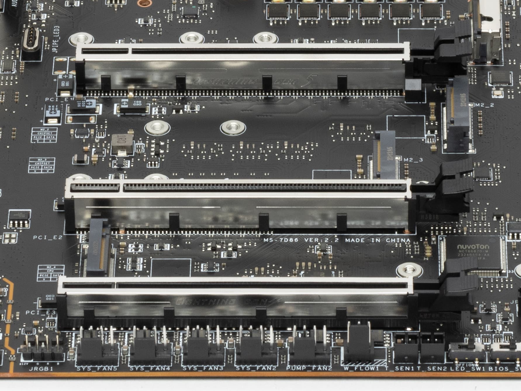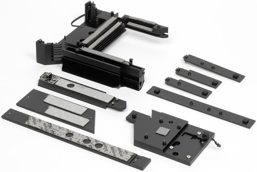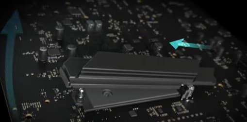 Следует особо отметить способ крепления радиаторов на слотах M.2 с помощью пружинных замков и вставных запоров (без винтов). Когда нажав на замок, радиатор легко поднимается и вынимается из запора.