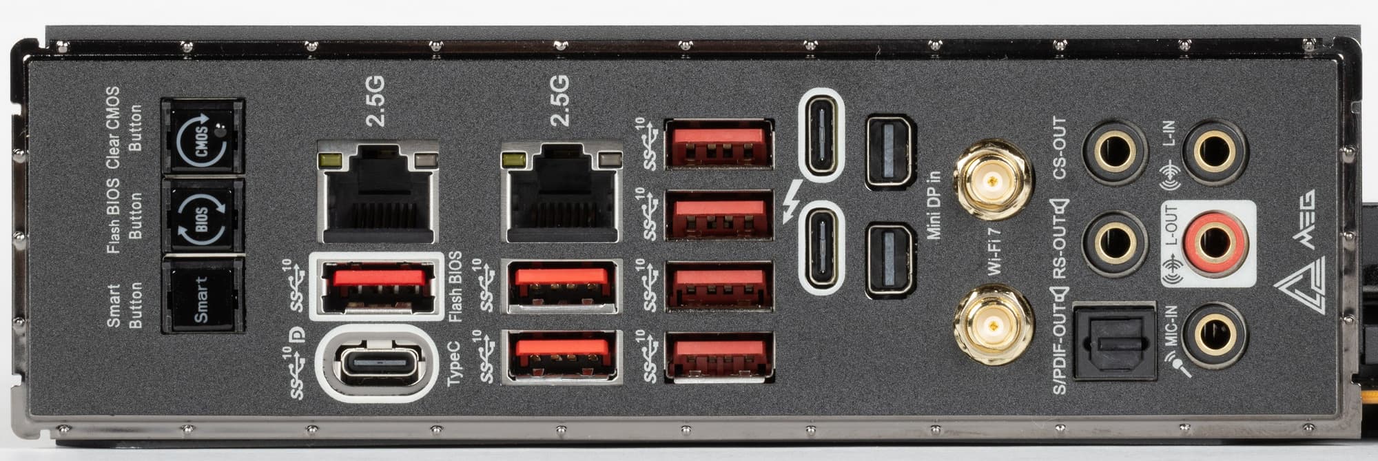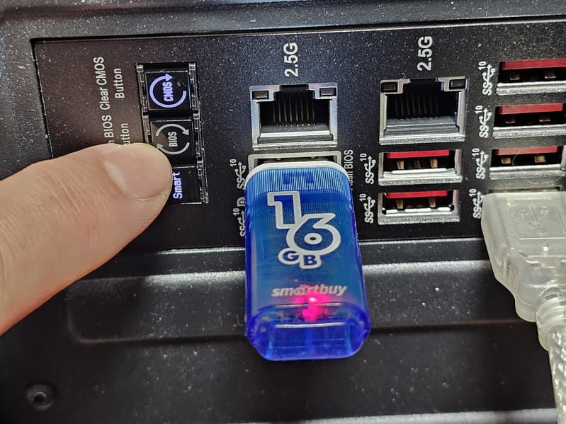 | Разъемы на задней панели | 3 × USB 3.2 Gen2 (Type-C) 7 × USB 3.2 Gen2 (Type-A) 2 × RJ-45 5 аудиоразъемов типа миниджек 1 × S/PDIF (оптический, выход) 2 × DP in (Thunderbolt4) 2 антенных разъема кнопка сброса CMOS многофункциональная кнопка Smart button кнопка перепрошивки BIOS — Flash BIOS |