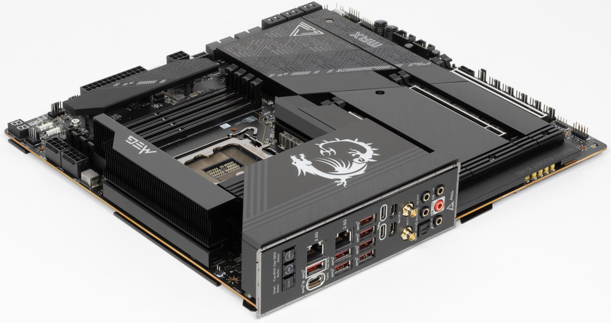Размеры обычные для форм-фактора E-ATX, однако все равно советую проверить вместимость корпуса и посадочные места под плату, потому что она с бэкплейтом, и есть свои нюансы.