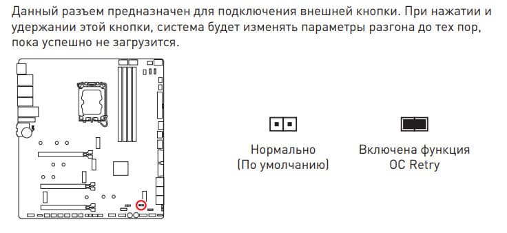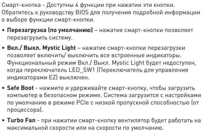 | Прочие внутренние элементы | 24-контактный разъем питания ATX 2 8-контактный разъем питания EPS12V 1 6-контактный разъем питания PCIe 1 слот M.2 (E-key), занят адаптером беспроводных сетей 1 слот PCIe x4, занят адаптером Thunderbolt4 2 разъема для подключения портов USB 3.2 Gen2x2 Type-C 2 разъема для подключения 4 портов USB 3.2 Gen1 2 разъема для подключения 4 портов USB 2.0 10 разъемов для подключения 4-контактных вентиляторов и помп ЖСО 1 разъем для подключения неадресуемой RGB-ленты 3 разъема для подключения адресуемой ARGB-ленты 1 разъем аудио для передней панели корпуса 1 переключатель для отключения подсветки LED_SW1 1 переключатель версий BIOS BIOS_SW1 1 разъем для подключения контроллера панели настроек JDASH1 1 разъем для подключения систем безопасности TPM 2 разъема для включения режима работы LN2 1 разъем для включения режима медленной загрузки JSLOW1 1 разъем для подключения кнопки повторных загрузок JOC_RT1 1 разъем для подключения режима безопасной загрузки JOC_FS1 2 разъема для термодатчикa 1 разъем для отслеживания скорости потока жидкости помп СВО W_FLOW 2 разъема для подключения управления с передней панели корпуса 1 кнопка включения питания Power 1 кнопка перезагрузки Reset |