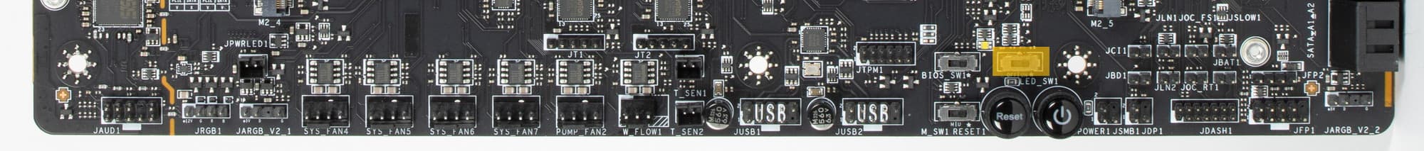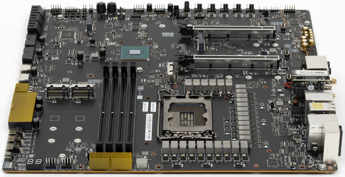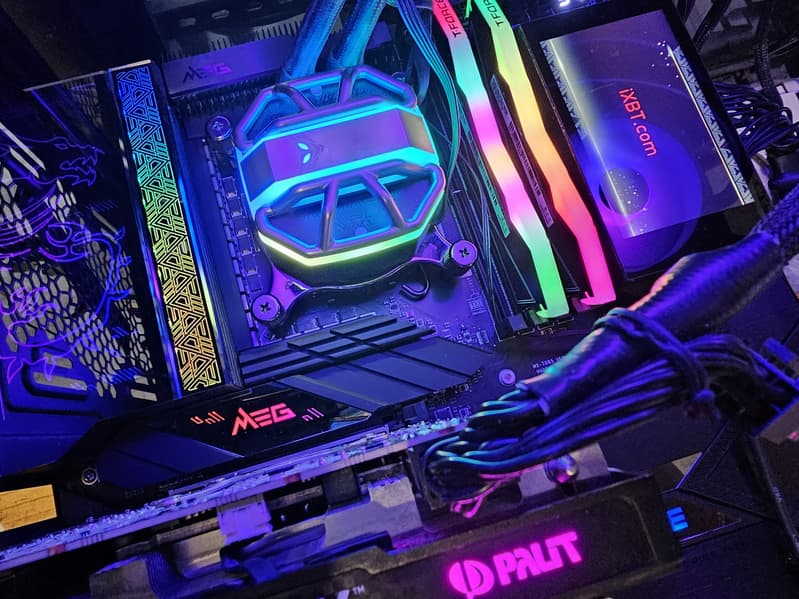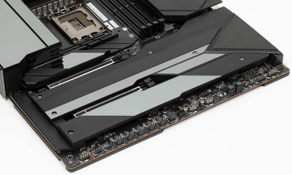 Также плата имеет 10 разъемов для вентиляторов. Система питания процессора очень мощная, она способна обеспечить работу любых совместимых процессоров с очень хорошим запасом на разгон. Плата имеет грамотную систему охлаждения каждого потенциально греющегося элемента, включая накопители в слотах M.2 (термопрокладки для охлаждения накопителей есть с обеих сторон). Сетевые возможности включают проводные контроллеры 2,5 и 10 Гбит/с и беспроводной Wi-Fi 6E + Bluetooth 5.2. Поддержка Thunderbolt 4 позволяет передавать данные на скорости 40 Гбит/с. В числе плюсов платы можно упомянуть очень красивую и стильную подсветку, включая широкие возможности для подключения дополнительных RGB-устройств. Отметим и улучшенный аудиокодек Realtek ALC4082.