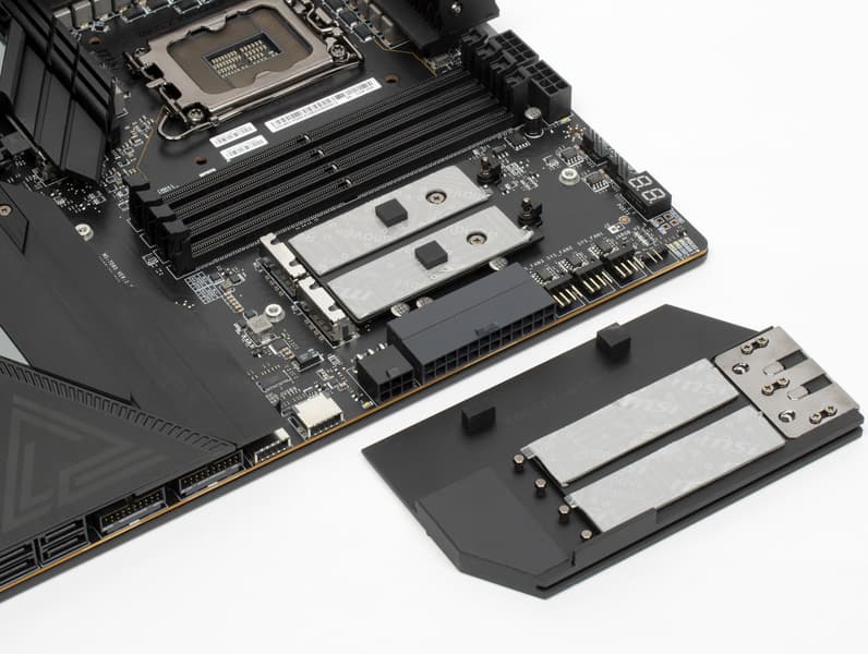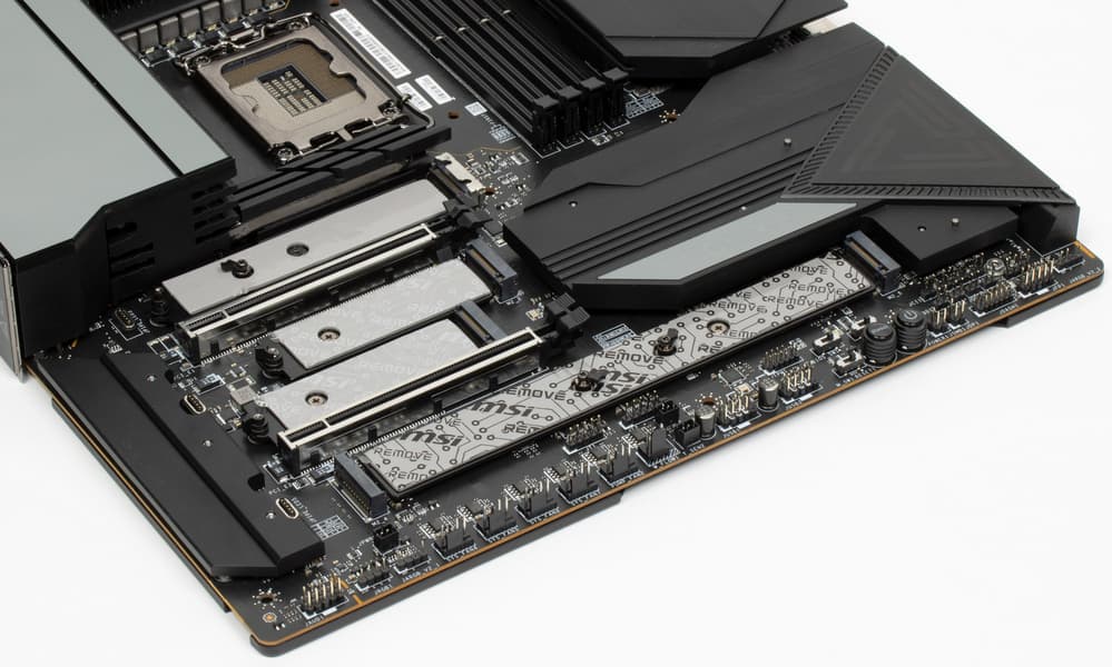 Не забываем, что нижний левый слот M.2_4 умеет работать с накопителями с интерфейсом PCIe версии 5.0. Зная, что такие устройства сегодня очень сильно нагреваются, потому и поставляются со своими массивными радиаторами охлаждения, очень странно выглядит желание инженеров MSI накрыть этот слот и соседний M.2_5 единым радиатором (скорее всего последний придется снять вообще при использовании модуля M.2 PCIe 5.0). Одно утешает: накопители с интерфейсом PCIe 3.0 (в M.2_5) почти не греются и могут работать без дополнительного охлаждения.