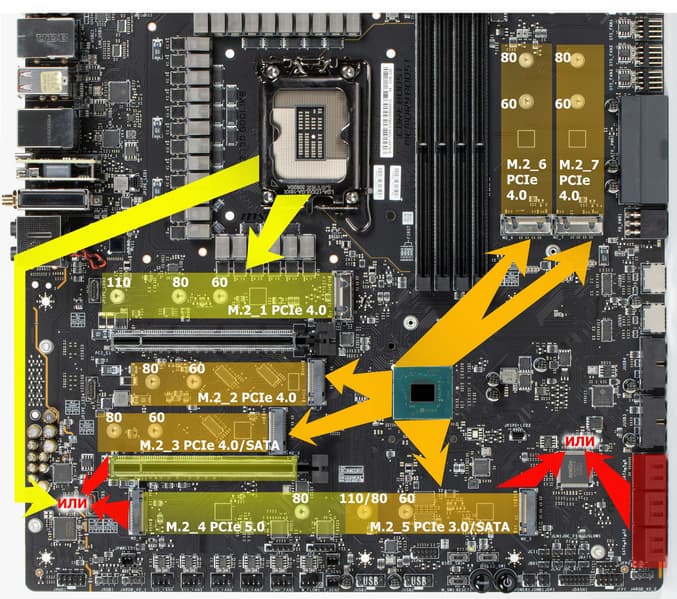 Второй, третий, пятый, шестой и седьмой слоты M.2 (M.2_2, M.2_3, M.2_5, M.2_6, M.2_7) получают данные от чипсета Z790, а M.2_1 и M.2_4 — от CPU (M.2_1 – PCIe 4.0, M.2_4 – PCIe 5.0).