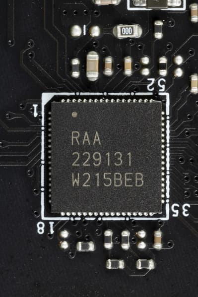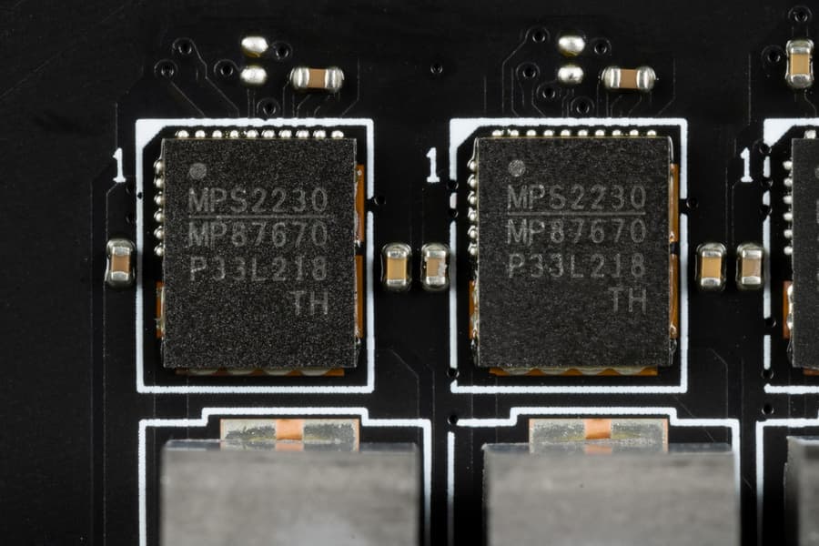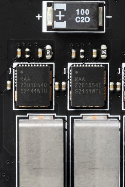 Каждый канал фазы имеет суперферритовый дроссель и RAA 22010540 MOSFET от Renesas) на 105 А.