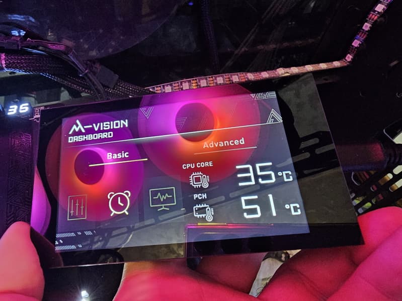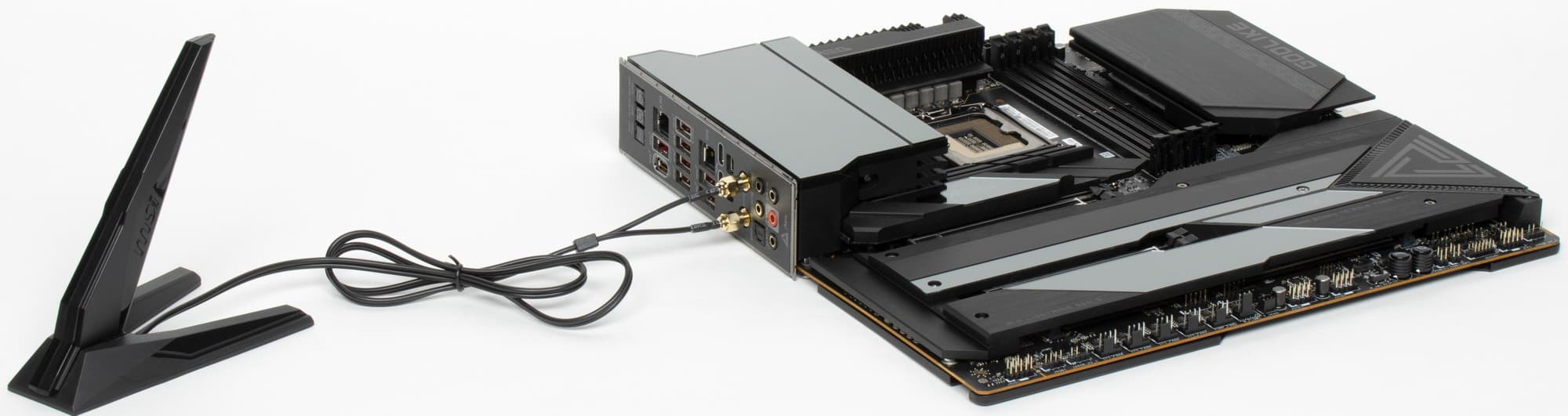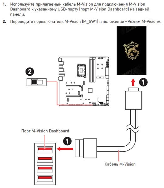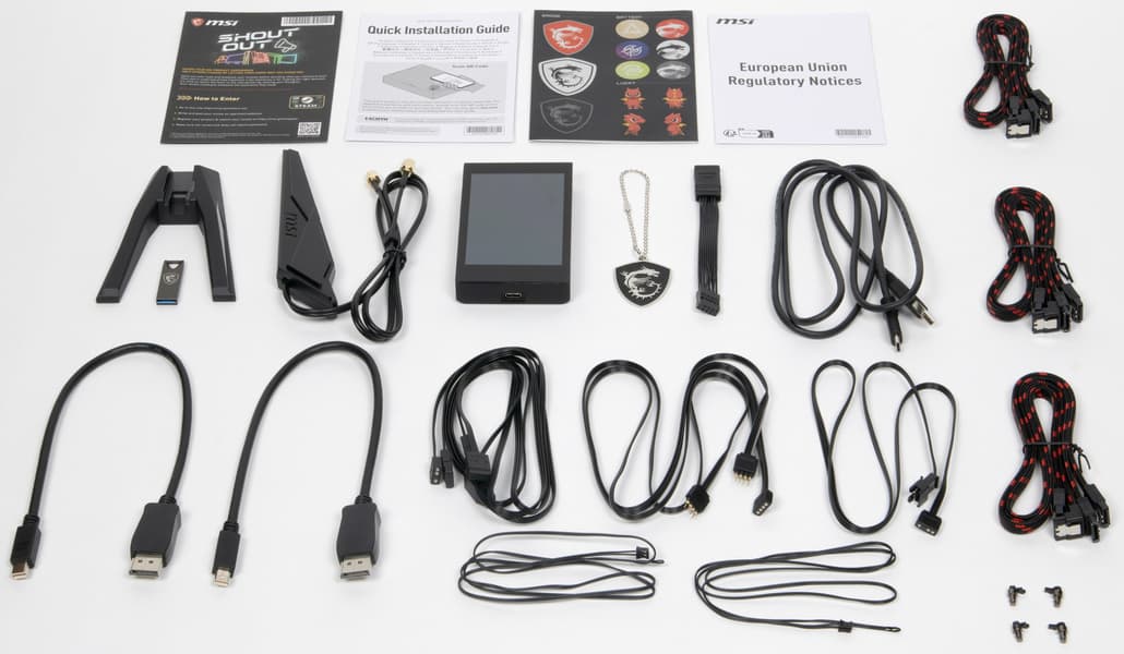 Комплект поставки соответствует флагманскому продукту: кроме традиционных элементов типа руководства пользователя и кабелей SATA (они, кстати, фирменные), имеются антенна встроенного Wi-Fi-модуля, запасные поворотные замки для М.2 слотов, разветвители для подключения подсветок, 2 внешних термодатчика, 2 кабеля-переходника mini-DP-to-DP, бонусные стикеры, накопитель типа «флешки», брелок, и внешняя приборная панель M-Vision c кабелем подключения к разъему USB Type-A.