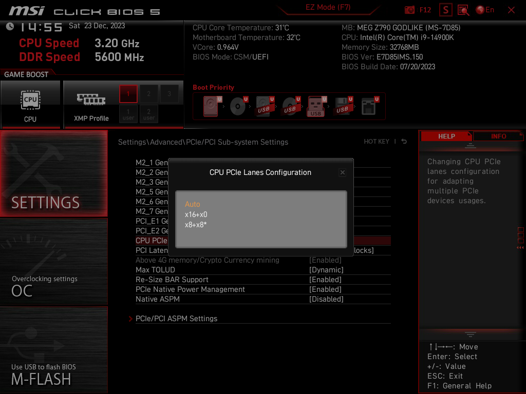 Теперь посмотрим выше на то, как работают процессоры в данной конфигурации. У CPU 14/13/12-го поколений всего 20 линий PCIe, 4 из них версии PCIe 4.0 отведены на порт М.2 (M2_1). Оставшиеся 16 линий PCIe 5.0 надо делить на два слота PCIe x16 (_1 и _2). Вариантов переключения несколько: