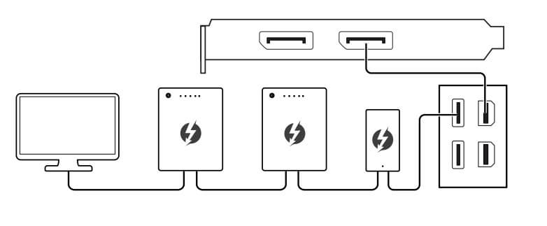 Модуль имеет 2 гнезда Type-C для вывода как через протокол TB, так и для использования в качестве USB 3.2 Gen2/1. Также модуль снабжен двумя гнездами DisplayPort (в форме mini-DP) для приема сигналов от внешних источников (видеокарты и др.), в комплект поставки входят адаптеры-переходники с полноформатных DP на мини-формат.